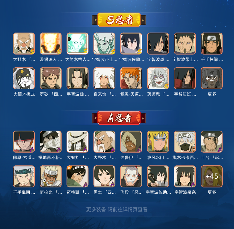 装备描述:1840w,41S, 60A,黑绝,飘带,天道超,十尾带土,漂泊二代,新春鼬,基本都有