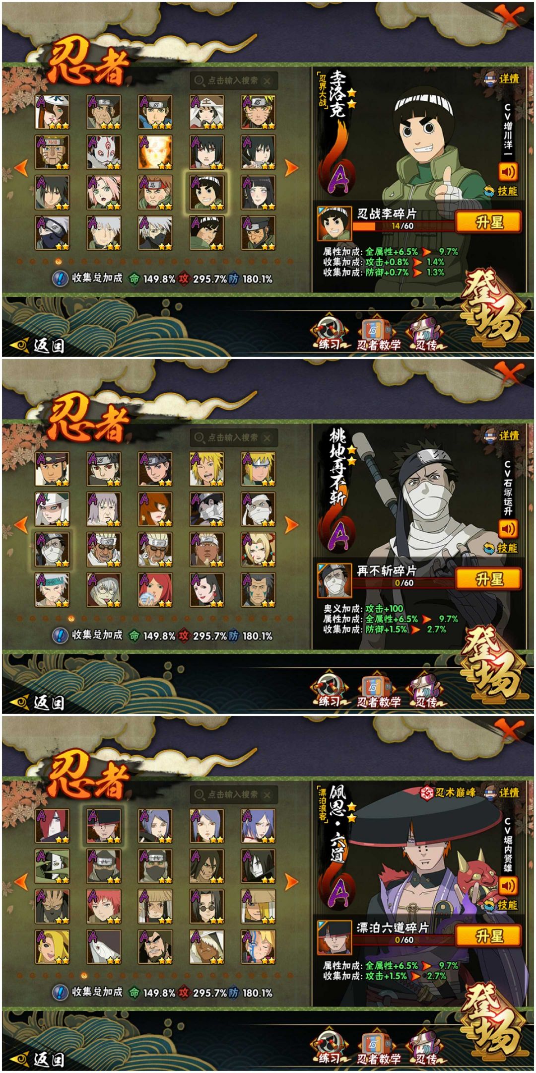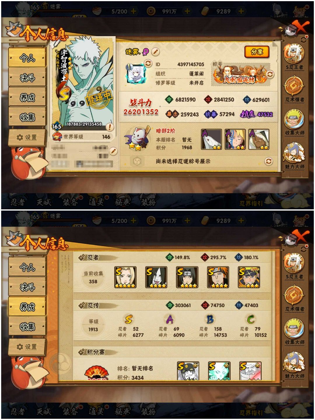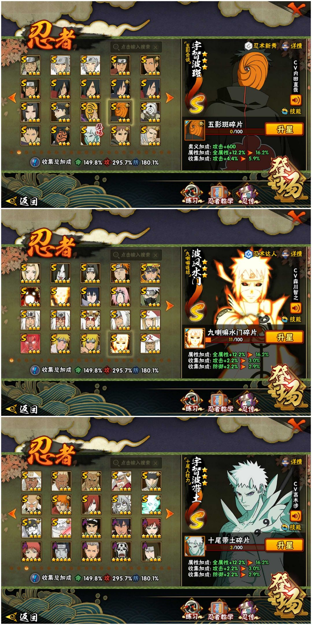 限制: 撤单率<40%才可租用此帐号装备描述:S忍者:【大野木 「忍界大战」,漩涡鸣人 「九喇嘛连结」,千手柱间 「木叶创立」,大筒木舍人 「最终章」,宇智波带土 「十尾人柱力」,宇智波佐助 「永恒万花筒」,宇智波斑 「木叶创立」,宇智波带土 「忍界大战」,千手柱间 「秽土转生」,大筒木桃式,罗砂 「四代目风影」,宇智波鼬 「秽土转生」,自来也 「舞之豪杰」,佩恩·天道 「超」,药师兜 「仙人模式」,宇智波斑 「秽土转生」,艾 「三代目雷影」,“宇智波斑” 「白面具」,千手扉间 「秽土转生」,纲手 「百豪」,无 「二代目土影」,宇智波斑 「五影会谈」,漩涡鸣人 「暴怒·第六尾」,宇智波止水 「须佐能乎」,艾 「忍界大战」,自来也 「传说中的三忍」,漩涡鸣人·宇智波佐助,艾 「四代目雷影」,波风水门,波风水门 「秽土转生」,大蛇丸,大野木 「三代目土影」,纲手,鬼灯幻月 「二代目水影」,佩恩 「天道」,千手扉间,千手柱间,神秘面具男,自来也 「仙人模式」,宇智波斑,宇智波鼬 「须佐能乎」,猿飞日斩,猿飞日斩 「秽土转生」,长门 「秽土转生」,自来也,神秘面具男 「红夜之刃」,宇智波斑 「秽土转生·解」,春野樱 「忍界大战」,大筒木金