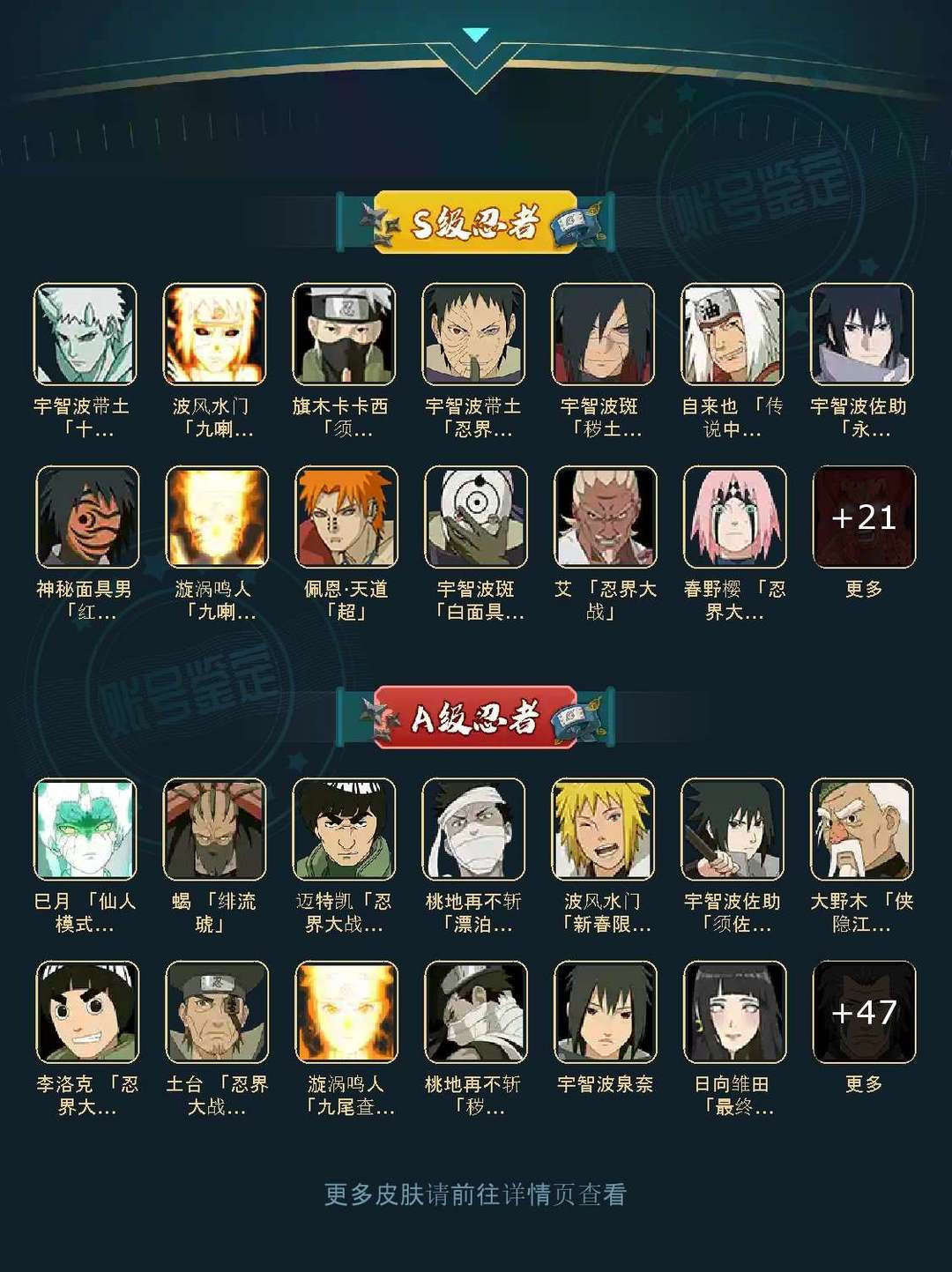 装备描述:34S 60A 256忍者 桃地再不斩「漂泊武士」/蝎 「绯流琥」/波风水门「新春限定」/巳月 「仙人模式」/迈特凯「忍界大战」/神秘面具男 「红夜之刃」/宇智波斑 「秽土转生·解」/自来也 「传说中的三忍」/宇智波带土 「十尾人柱力」/漩涡鸣人 「九喇嘛连结」/宇智波斑「白面具」/宇智波带土「忍界大战」/宇智波佐助 「永恒万花筒」/佩恩·天道「超」/旗木卡卡西 「须佐能乎」/波风水门 「九喇嘛连结」禁止利用账号进行开挂、使用辅助违规软件诈骗等违规操作。