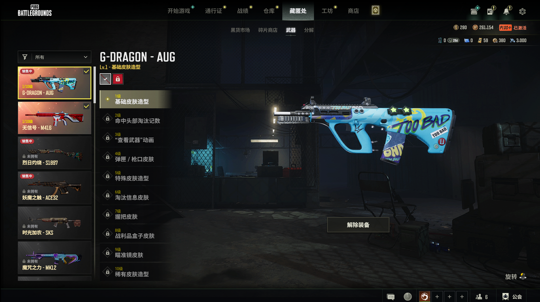 装备描述:二级密码059387保时捷卡宴权志龙AUG星魂白PNC套装黄金SKS计数98K粉兔套百搭黄道SKS