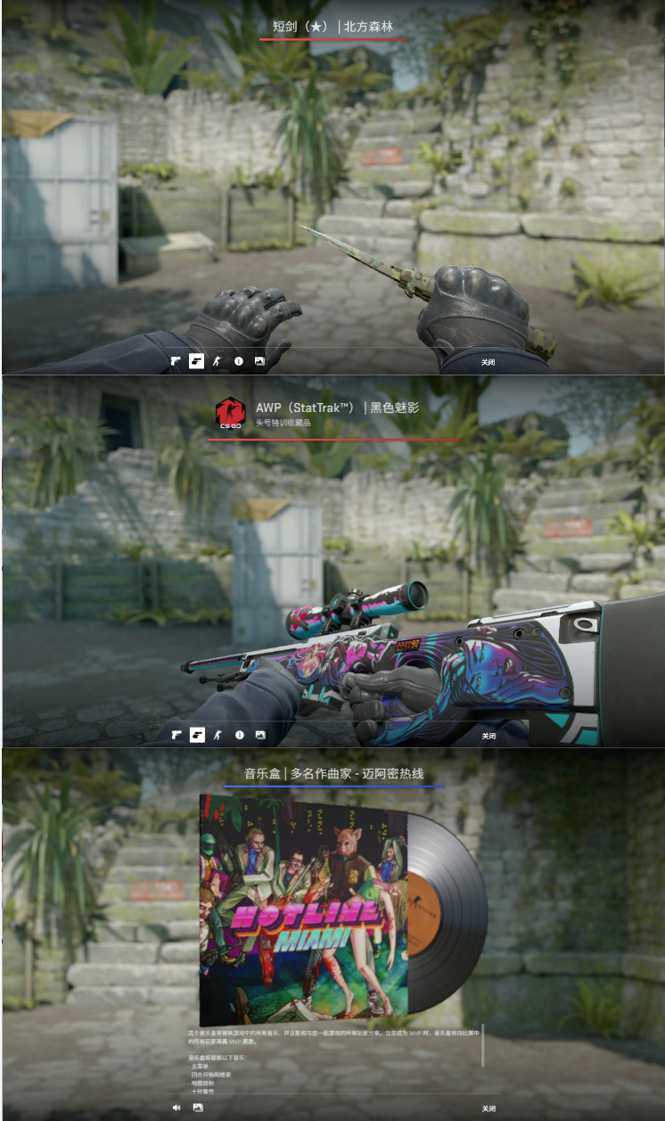 装备描述:完美老兵丶狙击手套装短剑北方森林丶awp略磨暴怒野兽丶迈阿密热线音.乐盒