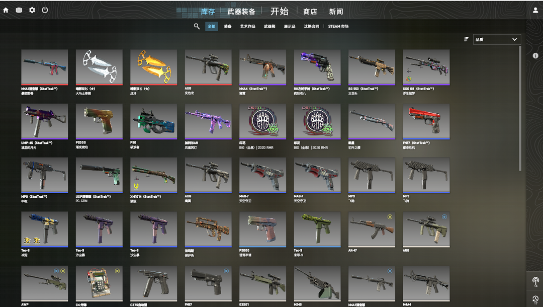 装备描述:完美新手5e丶双刀金银成都之心丶肛塞虎牙丶红皮暴怒野兽m4a1丶aug变色龙丶m4狮鹫丶左轮老八丶多主战皮肤