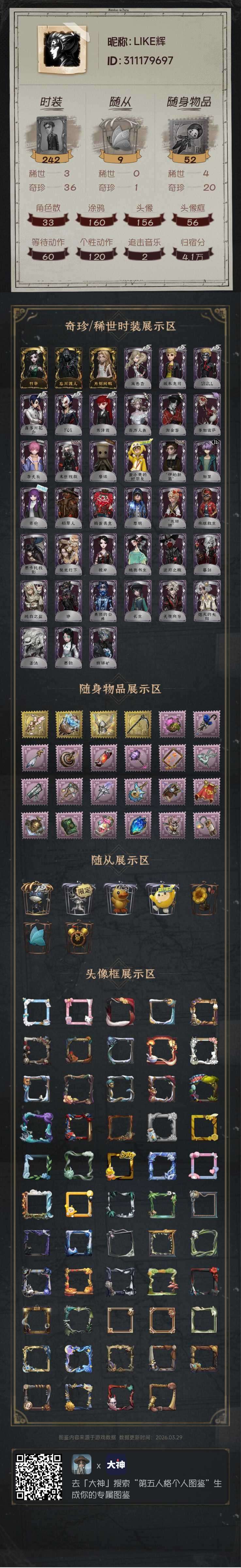 3稀世36奇珍时装,4稀世20奇珍随身物品,33角色,含杰克忘川渡人等热门金皮,联动限定p5