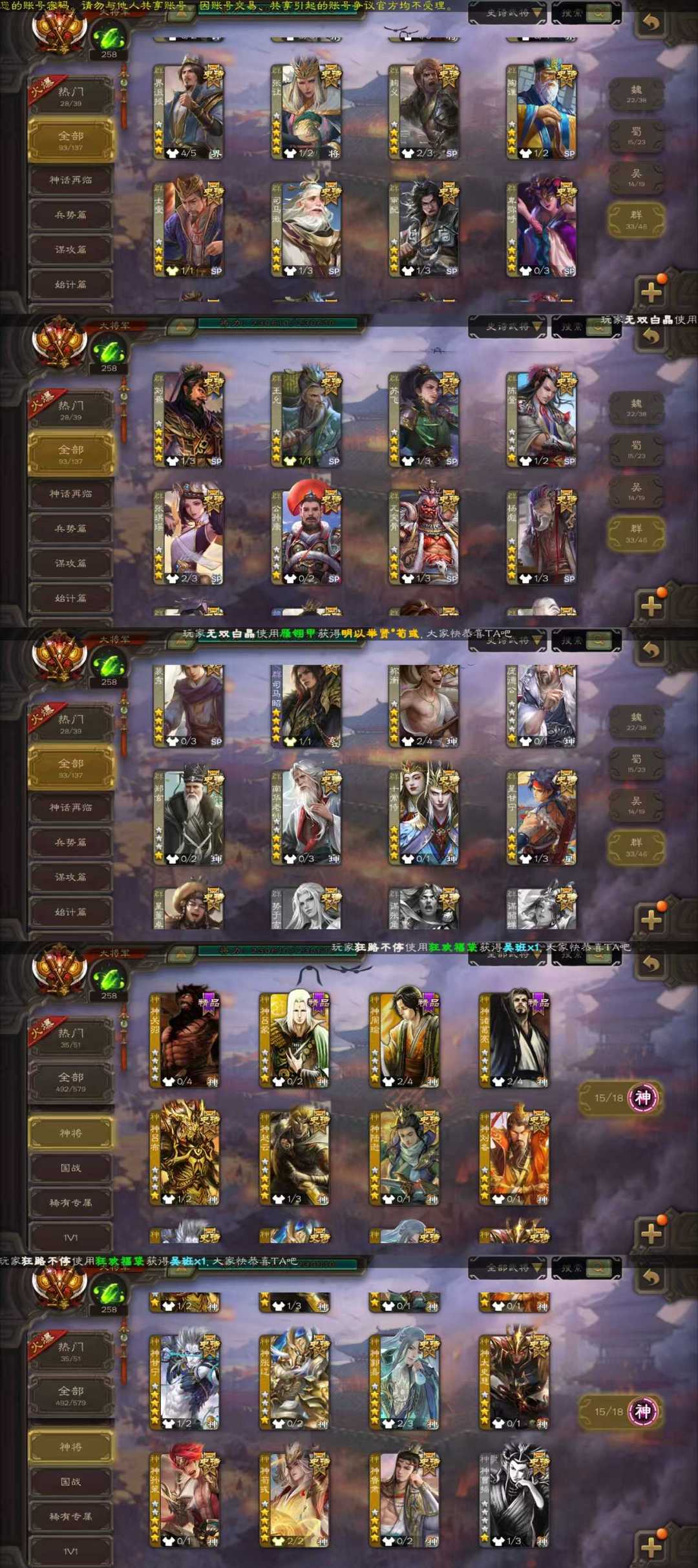 装备描述:23w将力93史诗95动皮六巨头三至尊皮一等大将军动态刘焉/动态神荀彧/倚星揽月动态神郭嘉/张仲景/得胜界沮授/动态神甘宁/曹髦/动态谋黄盖/动态文鸯/双形态杜预/潜蛟觊天双形态界钟会/张奋/动态孙寒华/十常侍/刘璋/动态杨彪/神鲁肃/神孙策/动态谋孙策等史诗,排位161武将