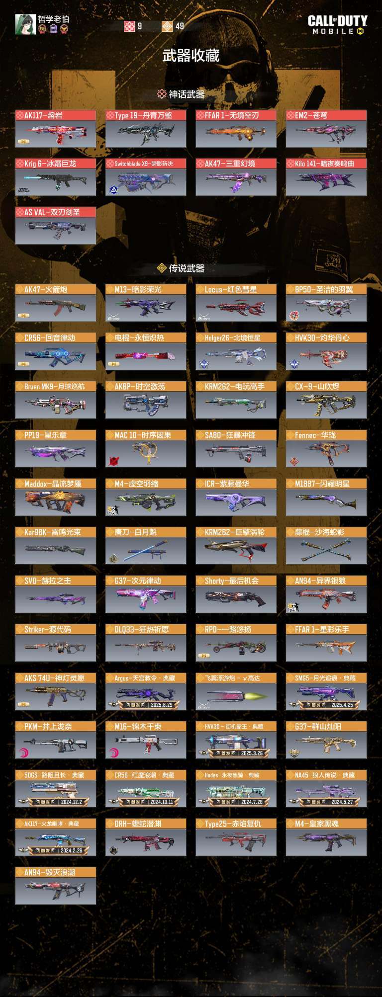 9神话49传说,武器有:四级大宝剑,三级冰龙,电玩喷,涡轮,1887传说,少前,唐刀,星瞳等联动。