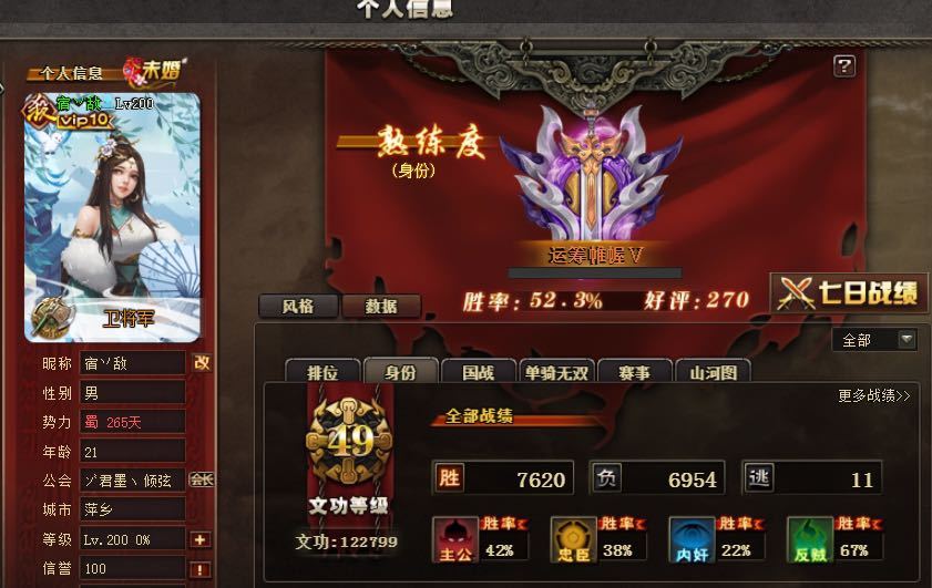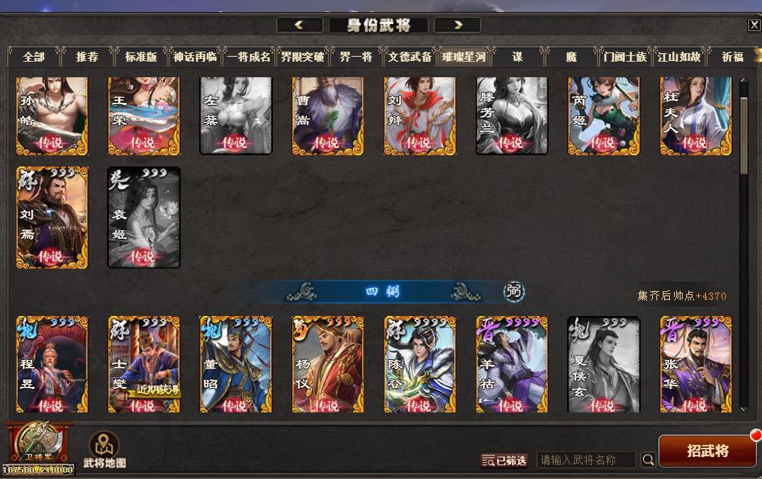 V10统帅卫将军19000点395武将1400皮肤4大祈费祎周处徐荣二袁谋董卓袁绍张华王荣张芝神权占