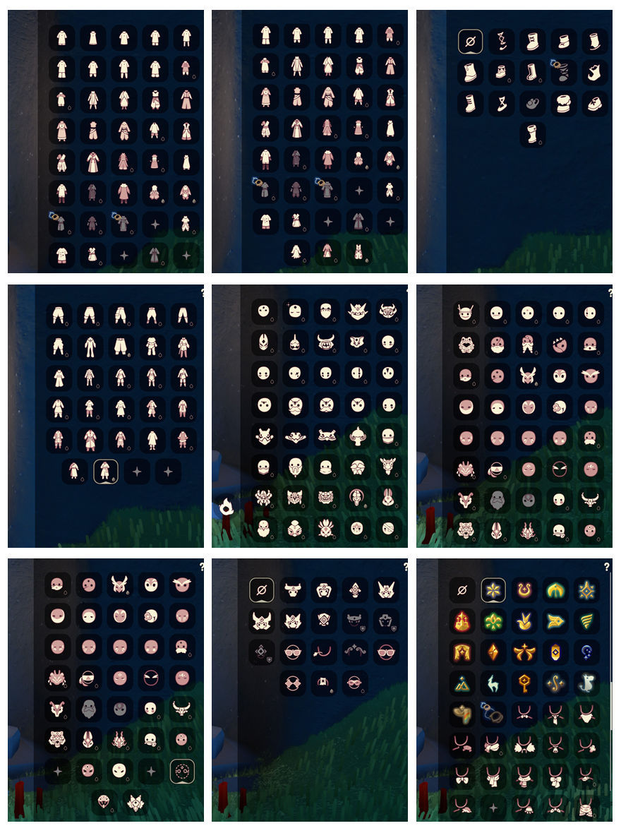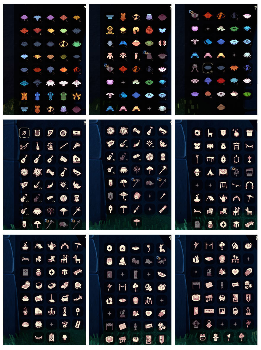 装备描述:远行服饰,挚爱装扮,披肩外袍,女巫长裙,雪人靴,悦动跑鞋,史力奇套装,祥云服饰,龙鳞束身,暗彩装扮,树精肩饰,优雅领巾,姆明饰品,水母肩饰,福娃套装,温暖绒帽,鲤鱼套装,海洋发型,彩虹帽,蝙蝠套装,巫师帽,朋克发型,双马尾发型,绊爱套装,倾福献瑞,史力奇帽子,小橘子,鲤鱼头饰,雪花头饰,贝壳头饰,小兔子,四叶草,星月头饰,金鳞耳坠,神鹿鹿角,彩虹耳饰,彩虹耳机,日光耳坠,枯角,鹿角,tgc斗篷,创始人礼包,小王子斗篷,星球夹克,欧若拉之翼,奉献斗篷,妮妮斗,海龟斗,遥鲲披肩,蜘蛛斗,皮皮猫斗,鸦羽斗,蛛丝斗,雪花斗,白绒斗,流星斗,粽叶斗,莲花斗,雏鸟之琴,音韵吉他,凯旋手琴,欧若拉之声,祥云纸伞,灯笼,夏日阳伞,飞行扫帚,献瑞折扇,秋千,跷跷板,花憩茶桌,小憩茶桌,狐狸背包,小船,冥龙南瓜,皮皮猫,水晶球,篝火点心,周年抱枕,大铁头