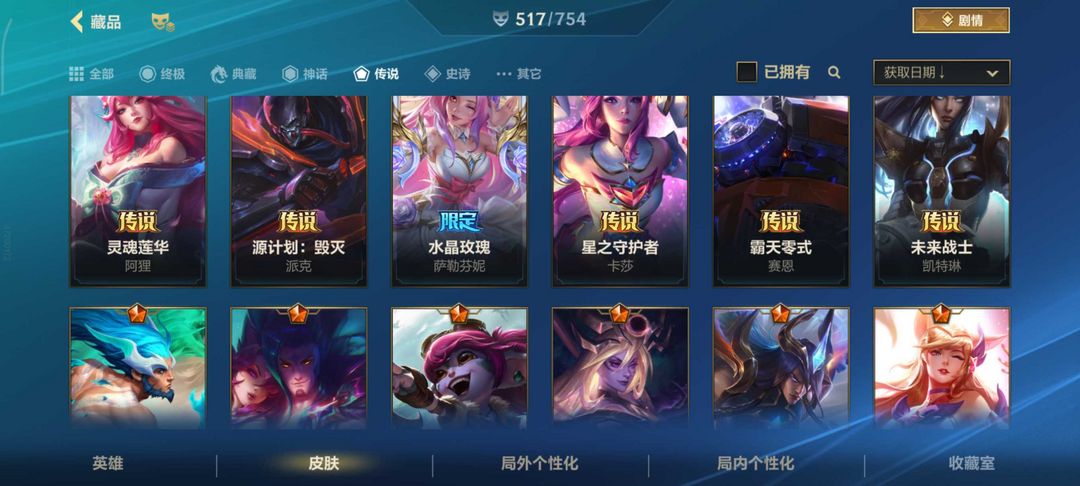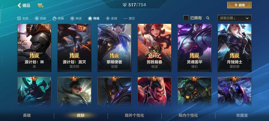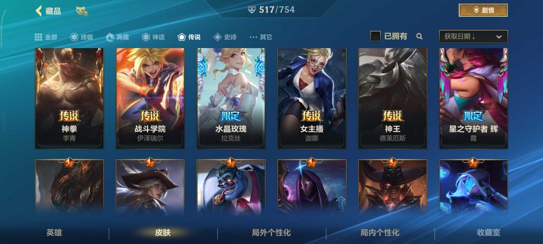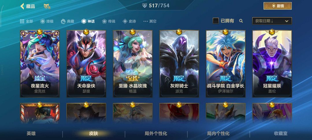 可排位517皮肤7神话55传说水晶玫瑰腕豪至臻格纹灰烬骑士派克冠星耀辰盖伦腕豪
