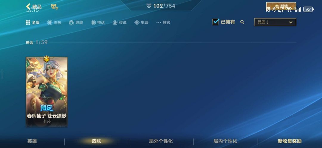 可排位❤️102皮❤️1神话6传说❤️春晖仙子苍云缥缈卡莎❤️星守霞❤️神拳盲僧❤️源计划剑圣
