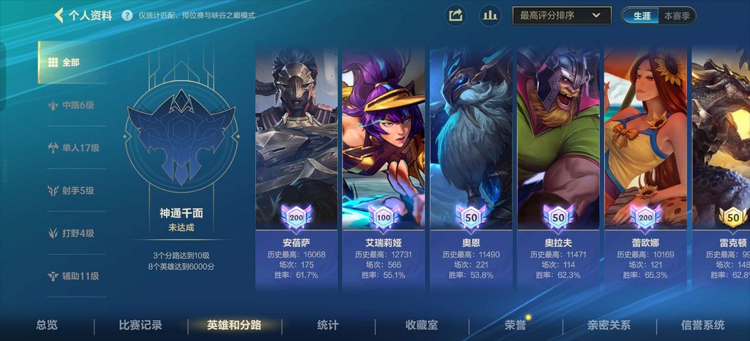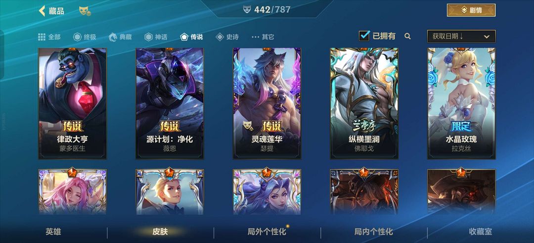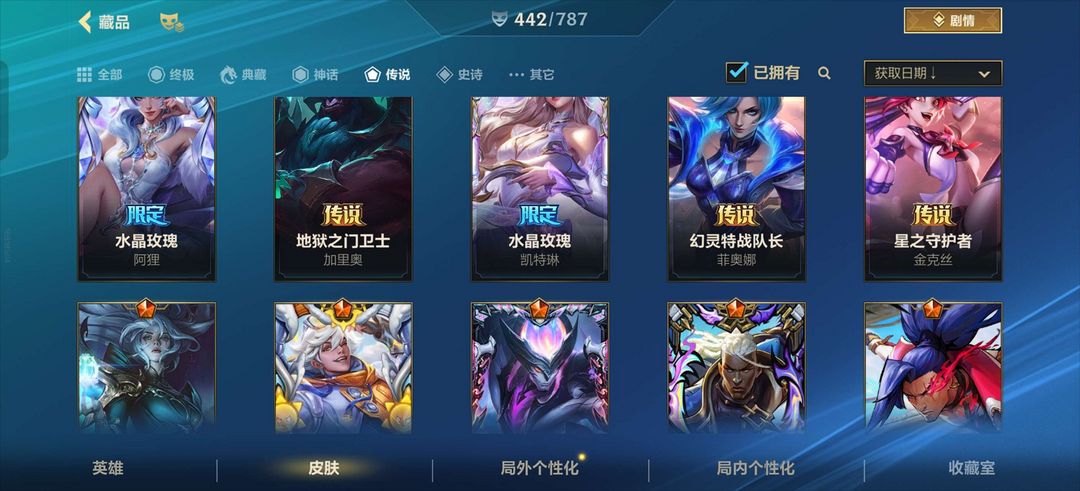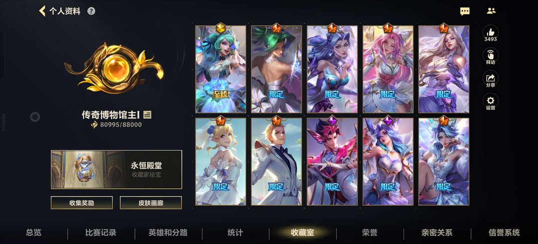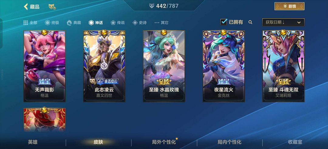 8万收藏值,【7神话 59传说 231史诗】历史多英雄国服,基本上每个英雄都有皮肤,可排位