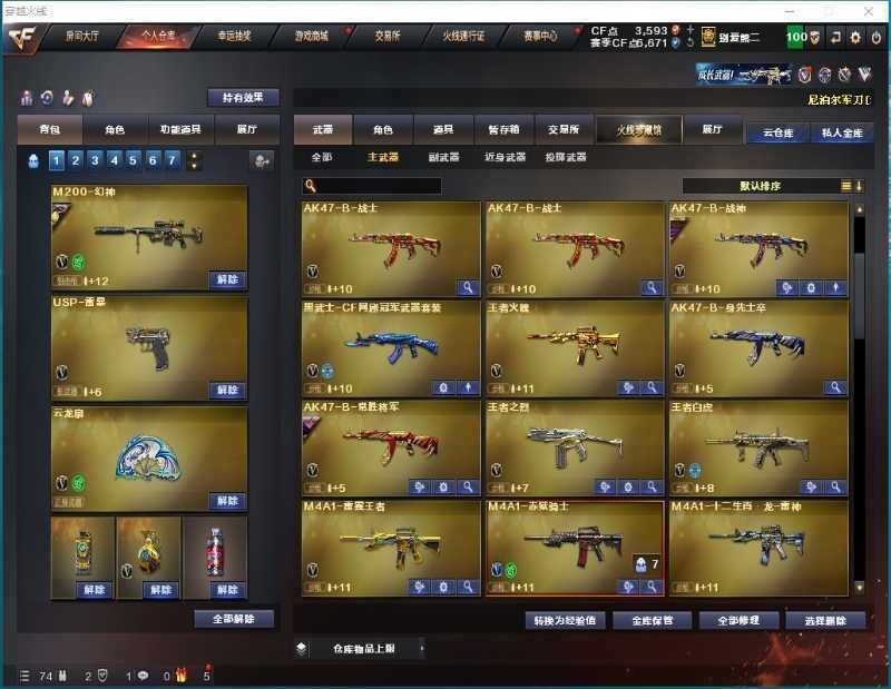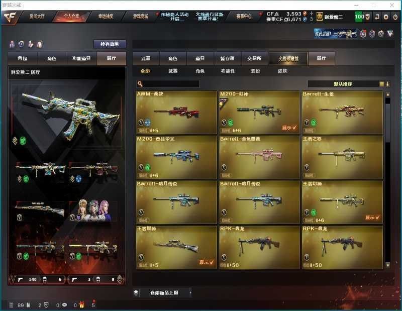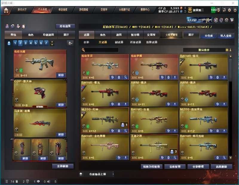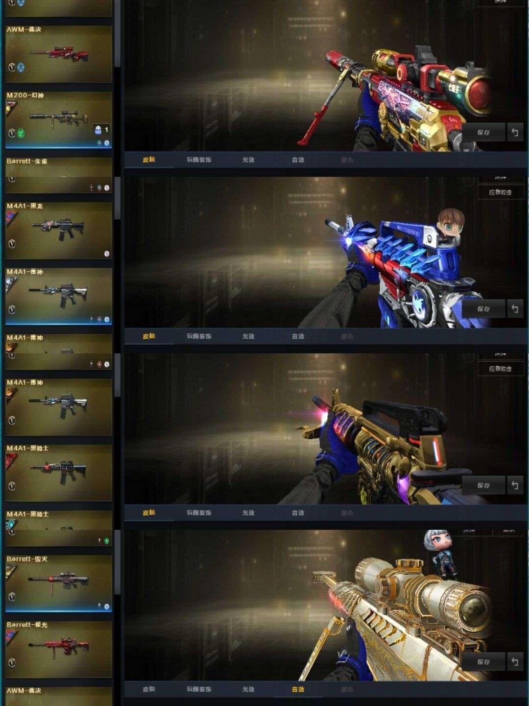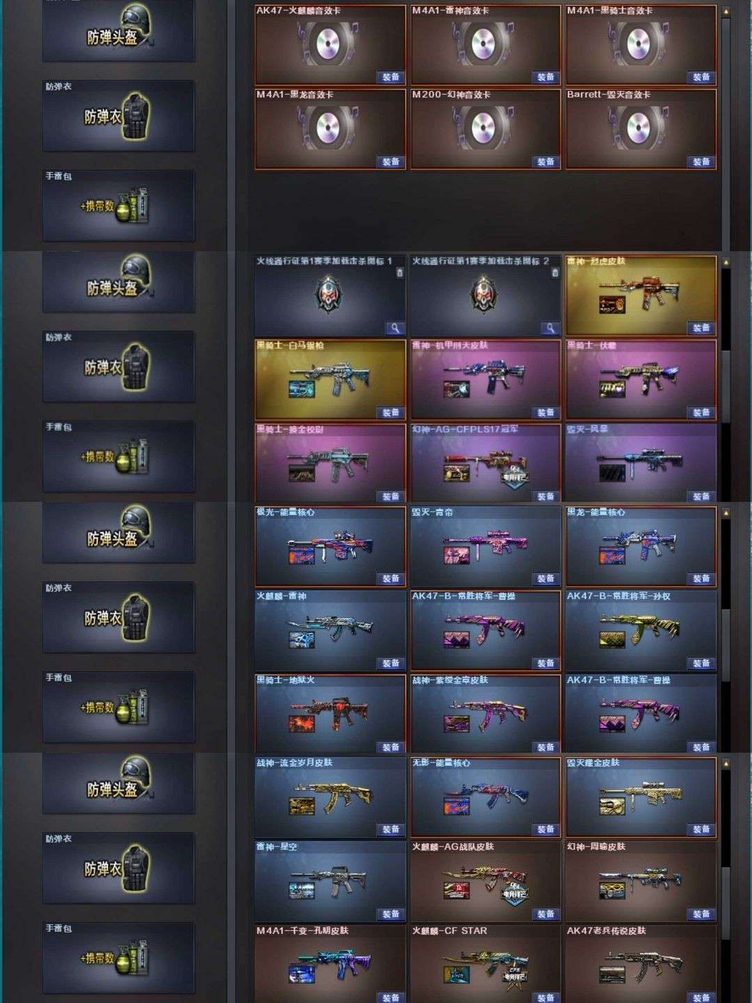 装备描述:雷霆王者之锋-觉醒版、生化弹匣、M4A1-雷神音效卡、M4A1-黑骑士音效卡、Barrett-极光音效卡、M200-幻神音效卡、Kar98K-星神音效卡、加特林-炼狱音效卡、QBZ03-金色蔷薇音效卡