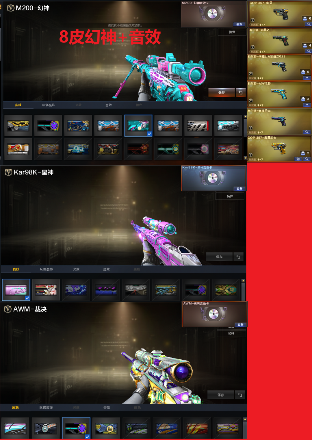 装备描述:排位:可以-----------爆破四防:幻神8皮+音效(传奇欧欧、星火小队、23白鲨、24AG、曹操、巅峰荣耀、周瑜、星耀皮肤)、M200-竞技荣光、98K星神、、、、无冕之王、COP幻灵、柯尔特竞技荣光、23白鲨柯尔特、COP雷霆王者、冠军之特、、、传说暗裔、白虎、QBZ金色蔷薇、炽芒蝶刃、、、1套雷暴、2套堕天神、5套幻灵、2套竞技荣光、7套雷霆王者、、、爆破四防(传说女帝、鹰、星际战将、影豹、王者貂蝉)