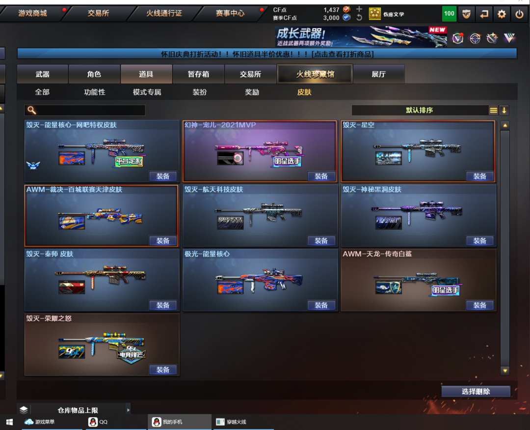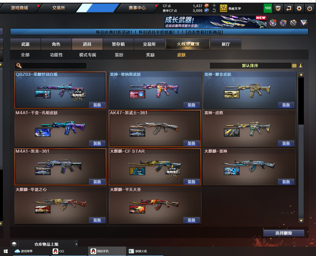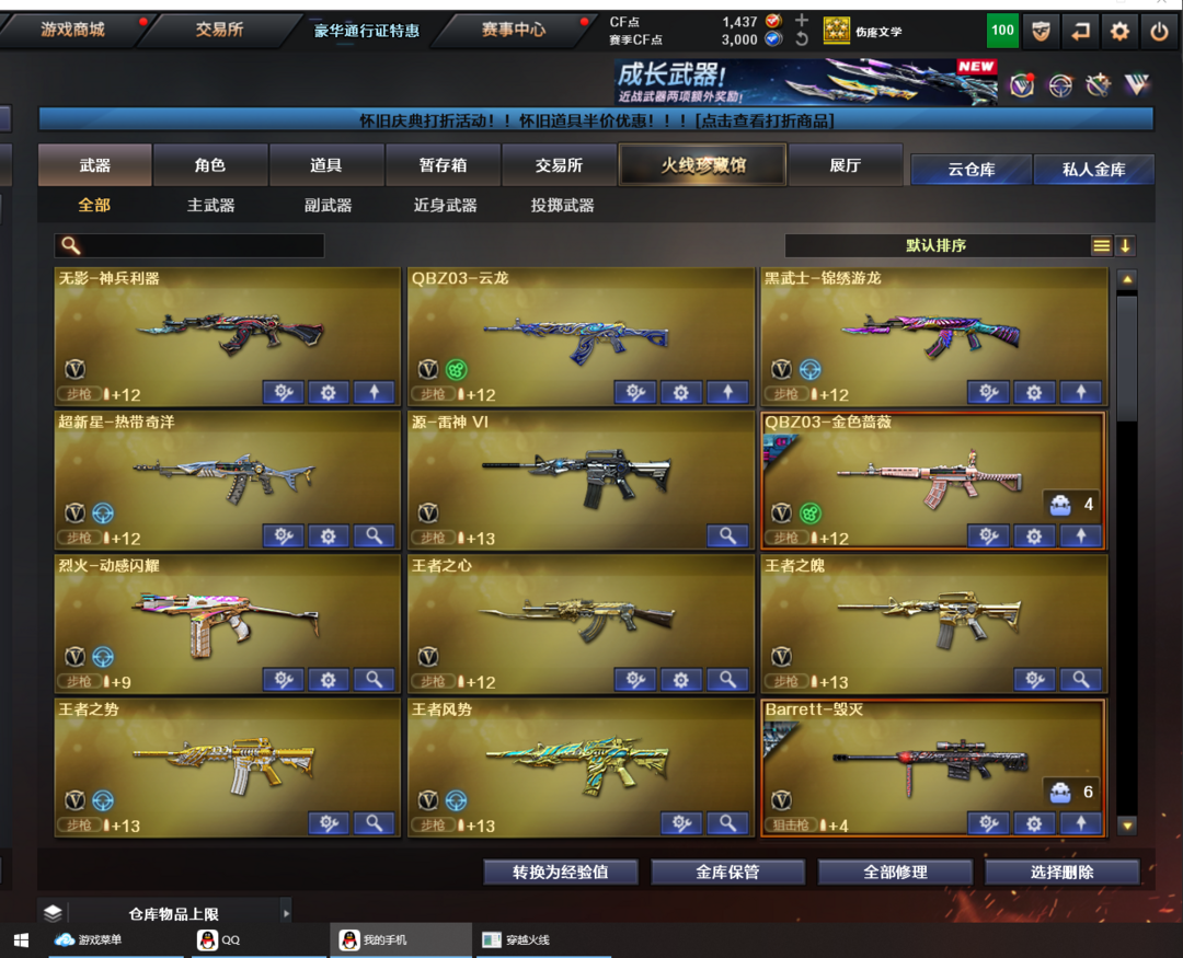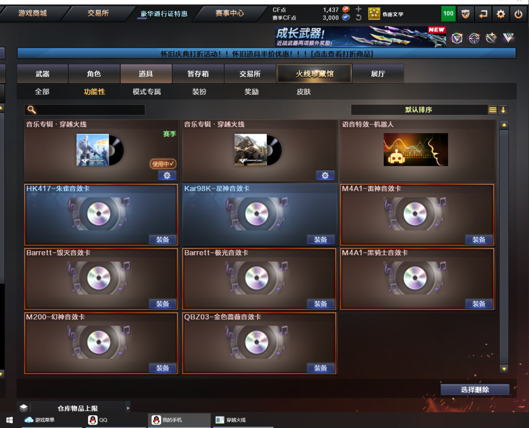 装备描述:多个音效卡(幻神,雷神,毁灭,极光,黑骑士,朱雀,qbz,98k)以及多个皮肤,冠军柯尔特,雷暴,带老板专用号