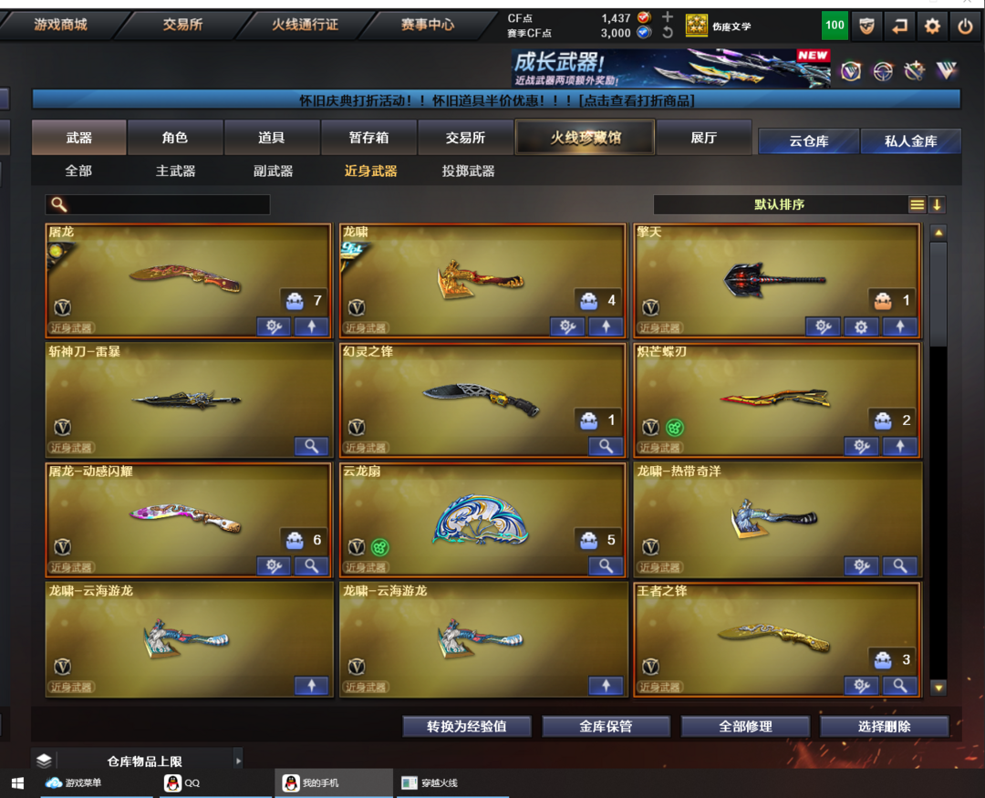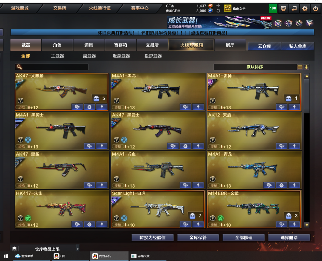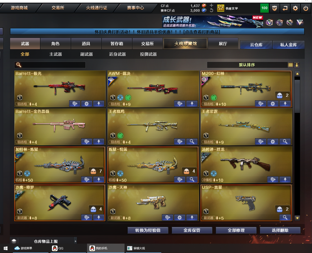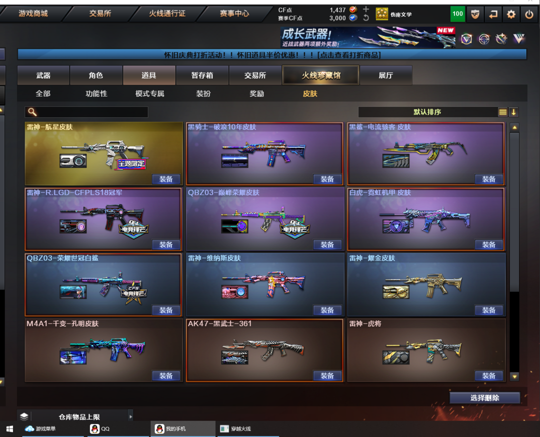 装备描述:多个音效卡(幻神,雷神,毁灭,极光,黑骑士,朱雀,qbz,98k)以及多个皮肤,冠军柯尔特,雷暴,带老板专用号