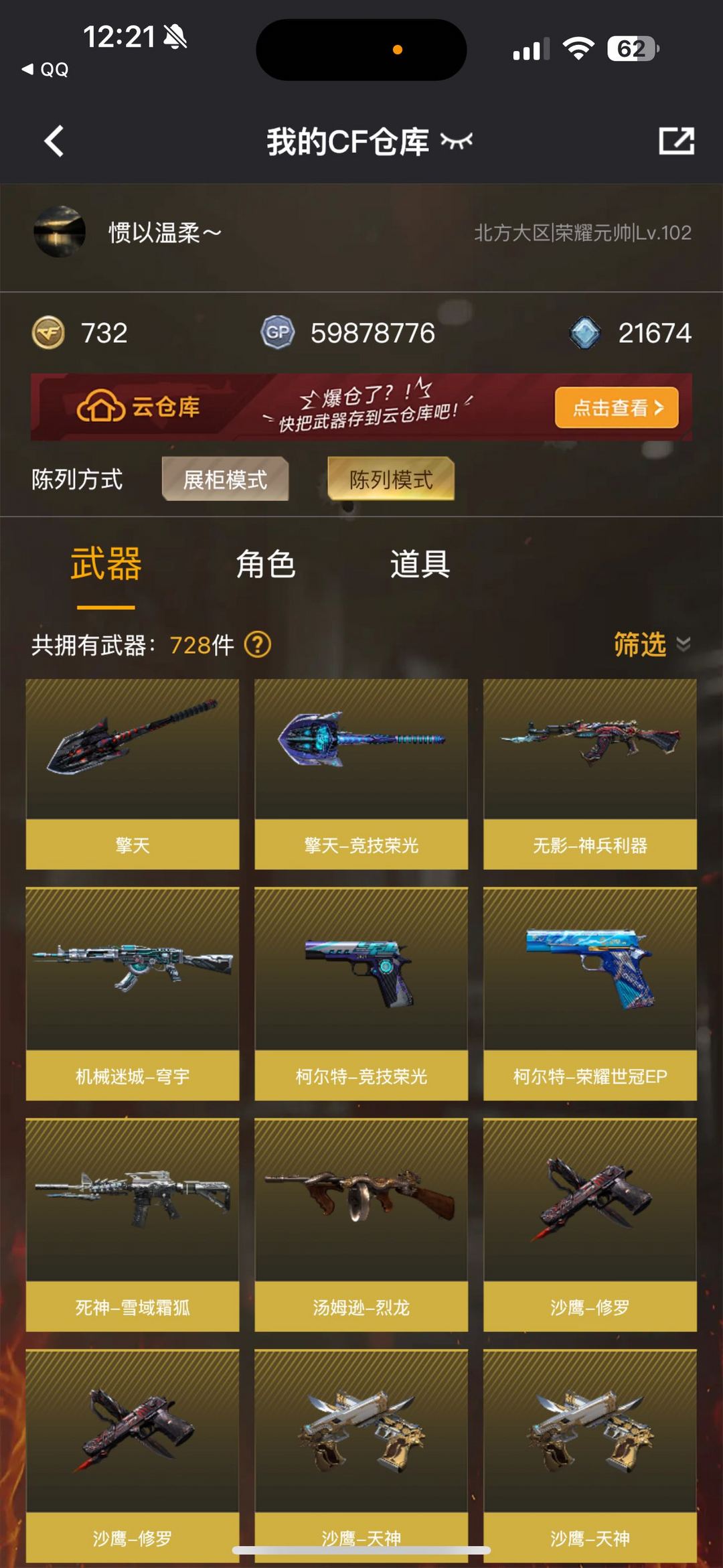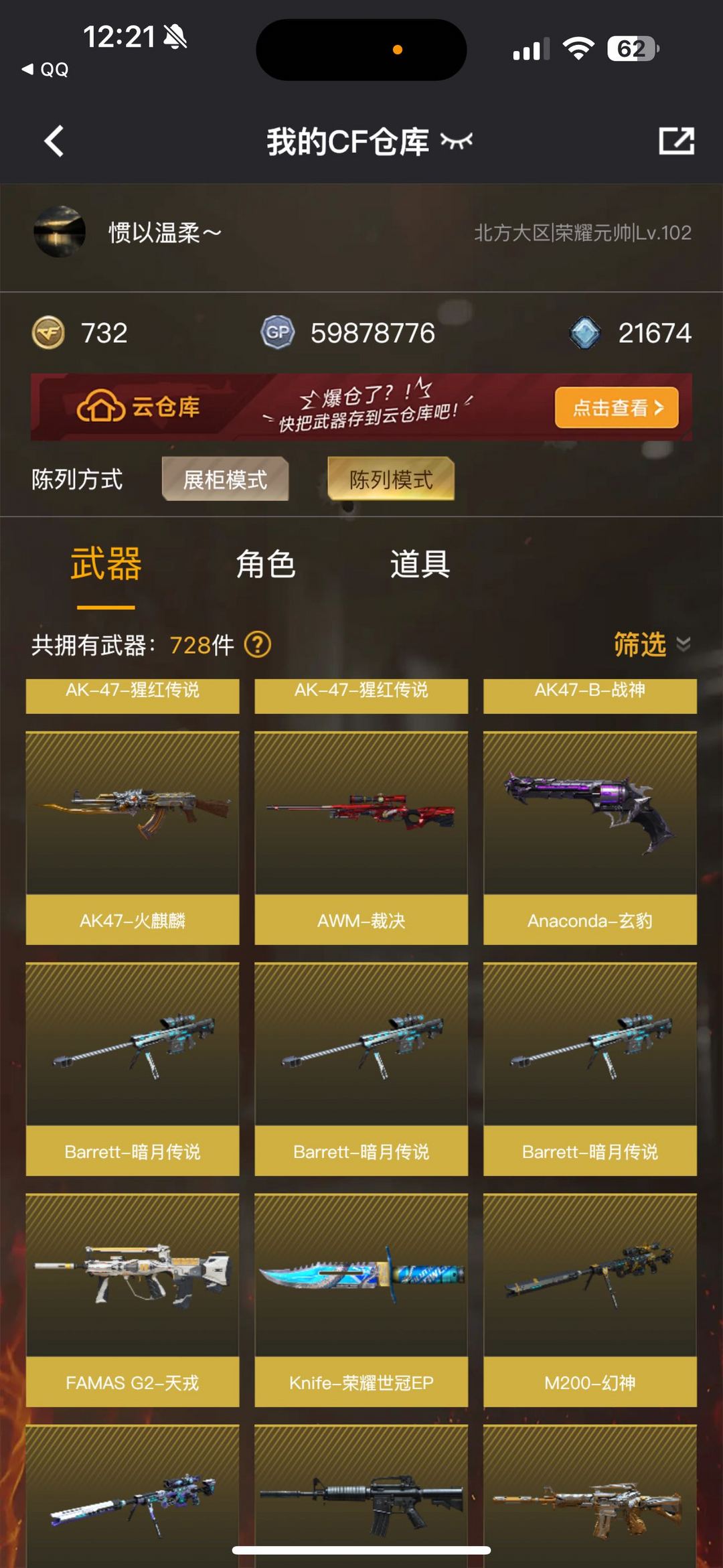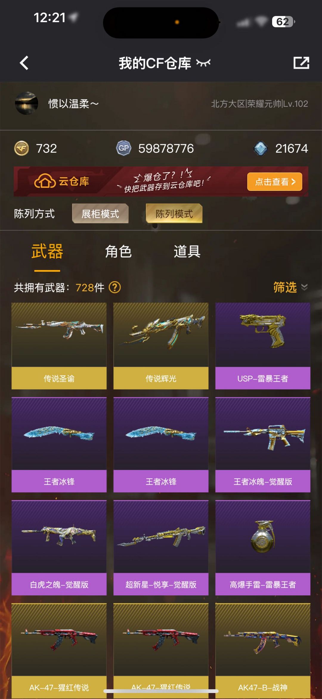 装备描述:【Lv.102 荣耀元帅】VIP5 107V,5王者,传说圣谕/传说辉光/幻神荣耀世冠EP /幻神AGCFPL S24冠军 /幻神丹凤/星神冠军之星/毁灭神秘黑洞/天龙CFSTAR/裁决运输船 /裁决百城联赛天津/裁决凤灵/裁决巅峰荣耀 /电竞教官-云悠悠/荆棘/战地猎狐/妮妮/_玄豹/M200-幻神/M200-竞技荣光/Barrett-暗月传说(3)/AWM-裁决/M4A1-雷神/竞技荣光套装/玄豹套装/M200-幻神音效卡/QBZ03-天罚音效卡/白虎-盛典舞曲音效卡/M4A1-黑骑士音效卡/死神-雪域霜狐-怀旧音效卡/AWM-昌龙-怀旧音效卡/AWM-裁决音效卡/沙鹰-修罗-盛典舞曲音效卡/炼狱-百战金芒-庆典舞曲音效卡