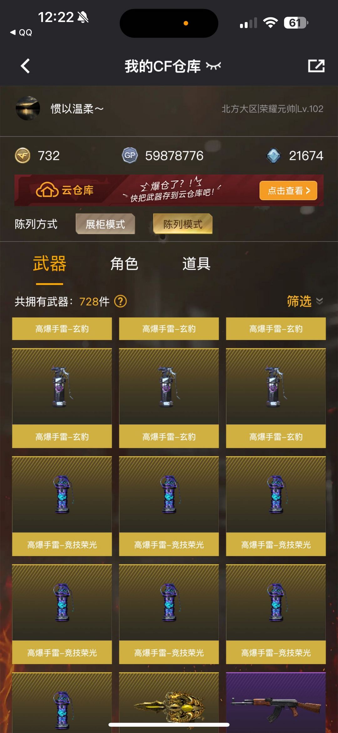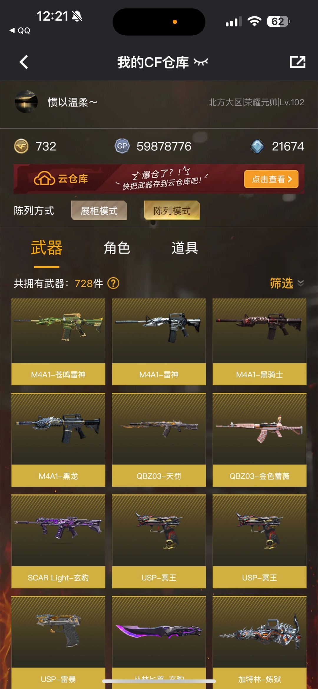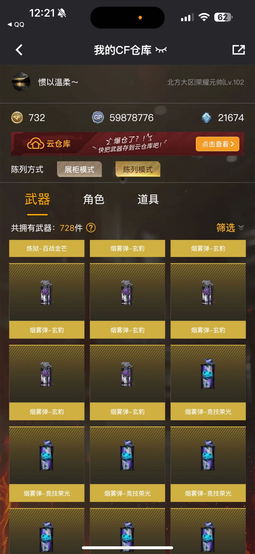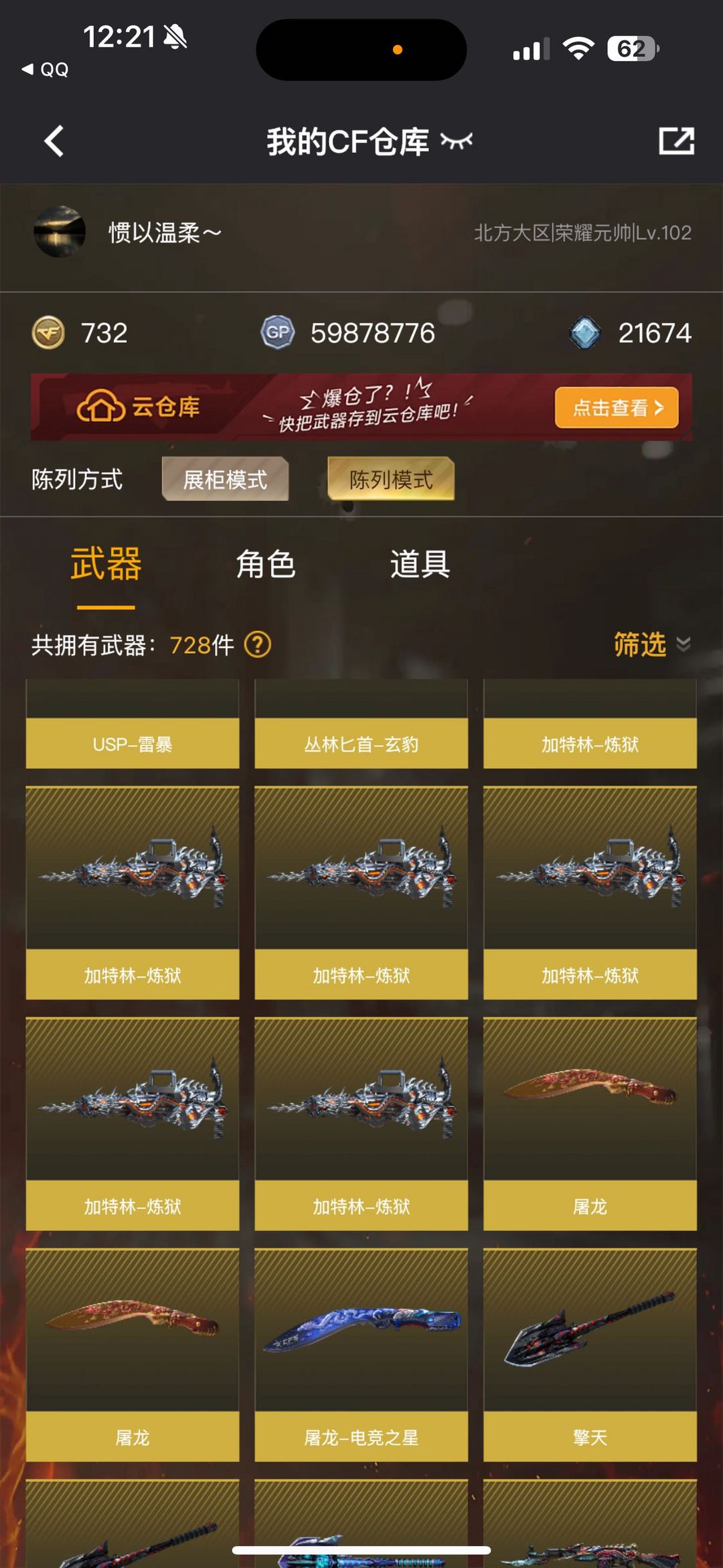 装备描述:【Lv.102 荣耀元帅】VIP5 107V,5王者,传说圣谕/传说辉光/幻神荣耀世冠EP /幻神AGCFPL S24冠军 /幻神丹凤/星神冠军之星/毁灭神秘黑洞/天龙CFSTAR/裁决运输船 /裁决百城联赛天津/裁决凤灵/裁决巅峰荣耀 /电竞教官-云悠悠/荆棘/战地猎狐/妮妮/_玄豹/M200-幻神/M200-竞技荣光/Barrett-暗月传说(3)/AWM-裁决/M4A1-雷神/竞技荣光套装/玄豹套装/M200-幻神音效卡/QBZ03-天罚音效卡/白虎-盛典舞曲音效卡/M4A1-黑骑士音效卡/死神-雪域霜狐-怀旧音效卡/AWM-昌龙-怀旧音效卡/AWM-裁决音效卡/沙鹰-修罗-盛典舞曲音效卡/炼狱-百战金芒-庆典舞曲音效卡