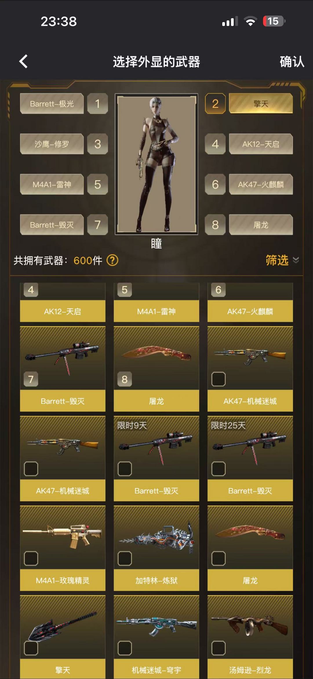 装备描述:rrett-毁灭;机械迷城-穹宇;AK47-火麒麟;沙鹰-修罗;Barrett-毁灭;屠龙;加特林-炼狱;汤姆逊-烈龙;M4A1-雷神;沙鹰-天神;AK12-天启;AK47-机械迷城;擎天;M4A1-玫瑰精灵;Barrett-极光