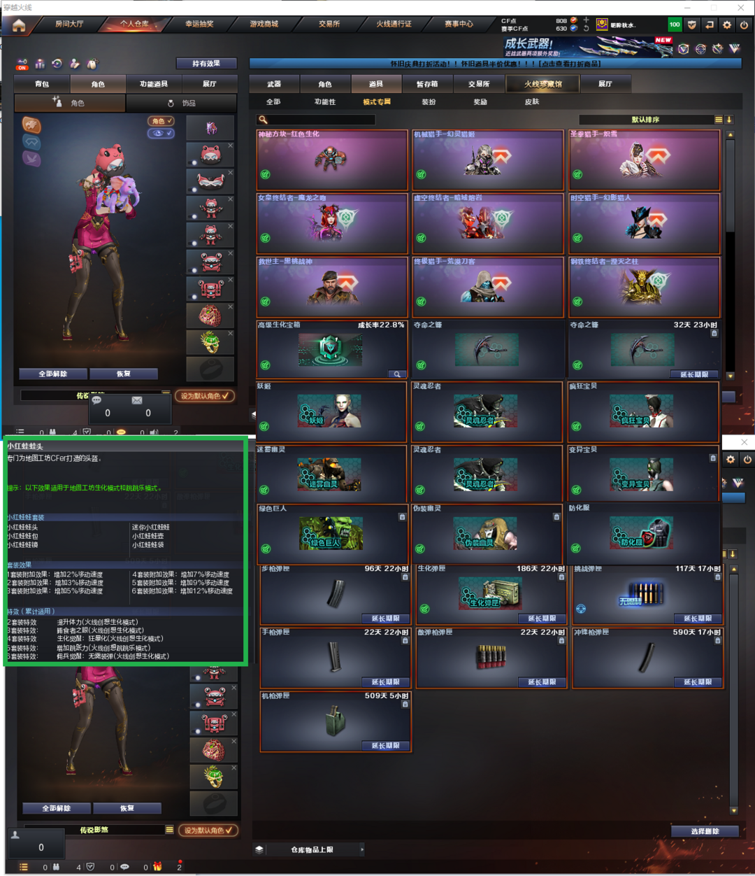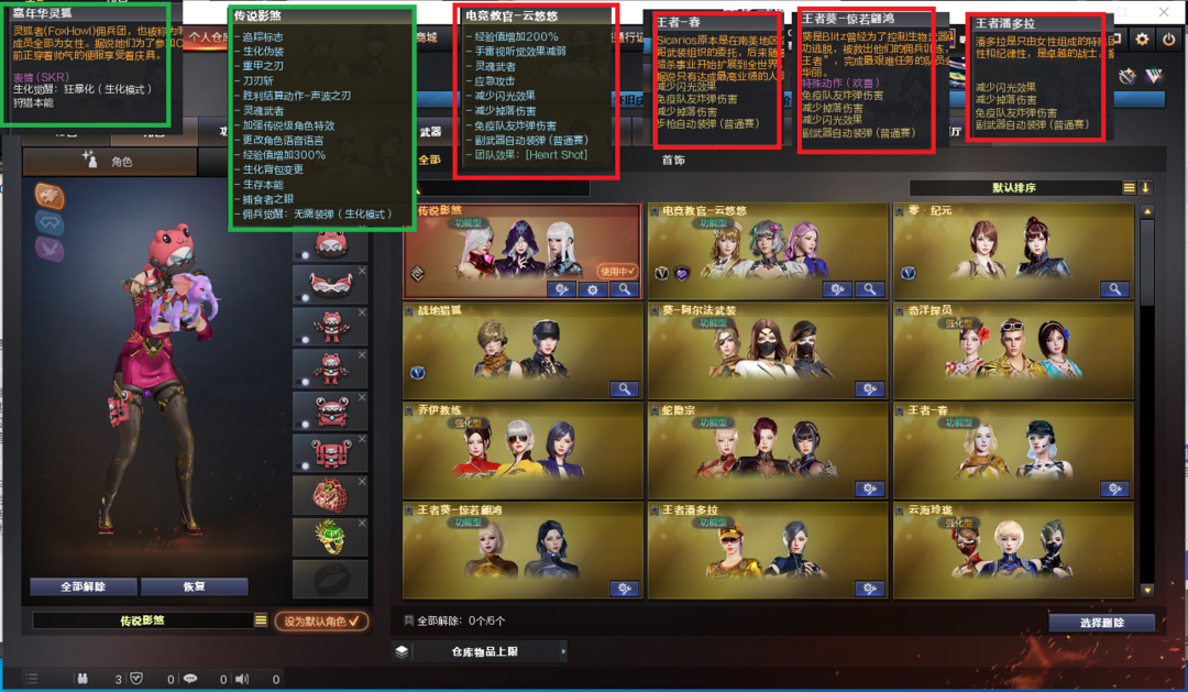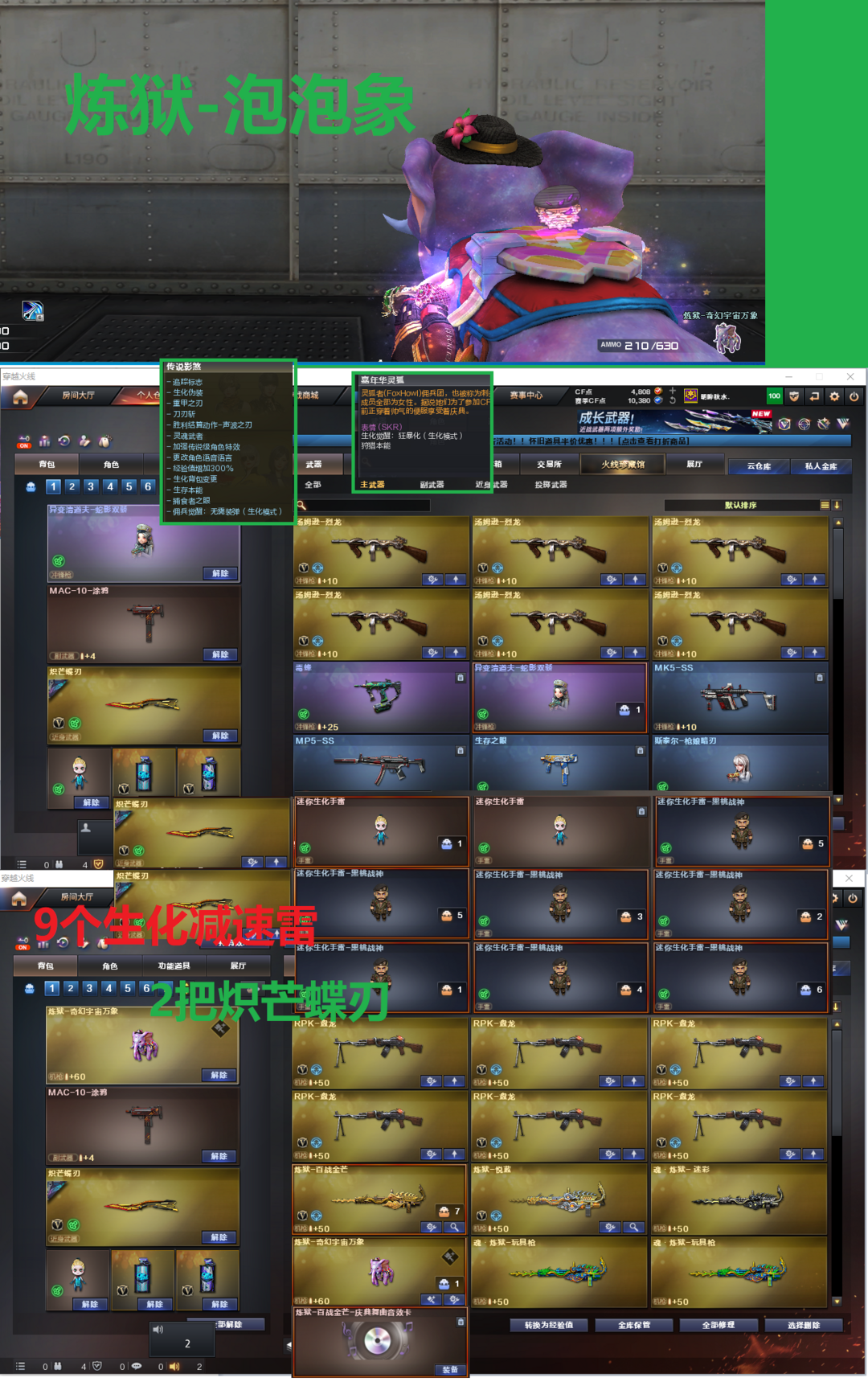 装备描述:排位:可以---------------生化四防极品号(可以变更生化背包、可以查看生化僵尸血量):无需换弹、6烈6盘龙、炼狱音效、炼狱-泡泡象、斯泰尔枪娘暗刃、异变清道夫-小人枪、毒蜂、死亡之眼、MAC涂鸦、2把炽芒蝶刃、9个永久生化减速雷、超级对讲机、全部弹匣、、、、、、、、、、、爆破四防:幻神2皮+音效(23白鲨、电流骇客皮肤)、王者星霆、王者风神、M200-竞技荣光、USP雷暴、4个柯尔特竞技荣光、USP神工天巧、COP云龙、传说圣谕、王者凌虎、王者玄武、QBZ金色蔷薇、、、幻神音效、裁决音效、炼狱音效、黑骑士音效、、、7套竞技荣光、1套云龙、、、生化四防(传说影煞、嘉年华灵狐)爆破四防(云悠悠、王者春、王者惊若翩鸿、王者潘多拉)