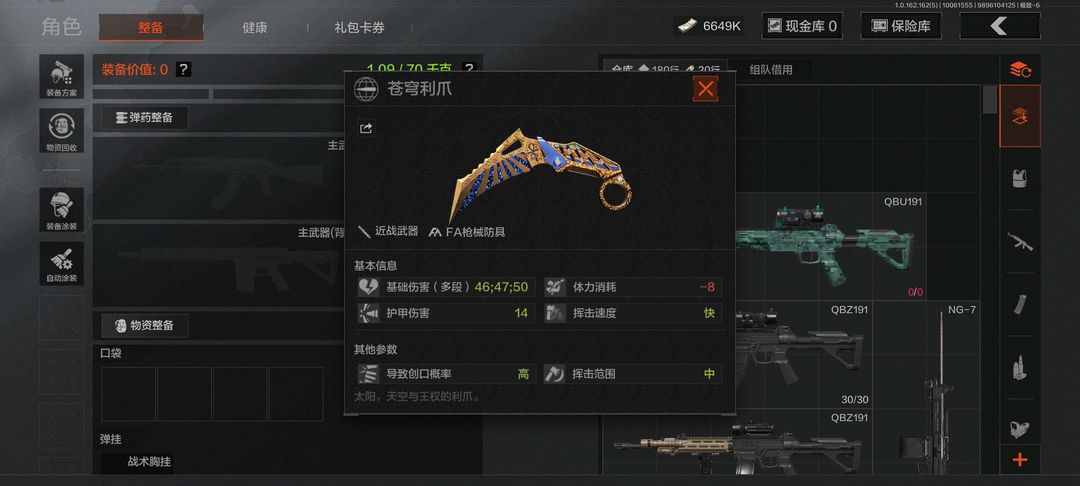 660万纯币!六格保险,装备子弹电台钥匙门卡皆有,30级可强化多租多送!竟技FAL,刀皮苍穹利爪