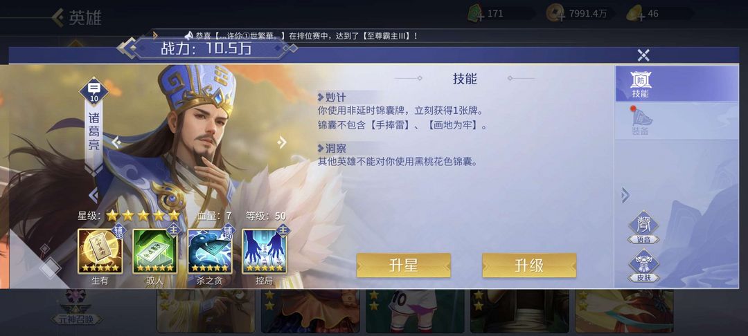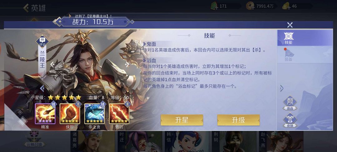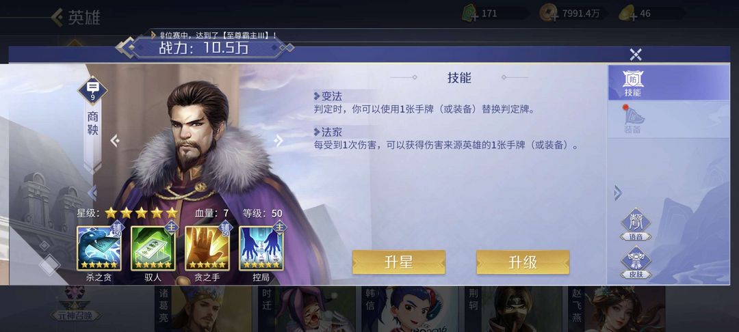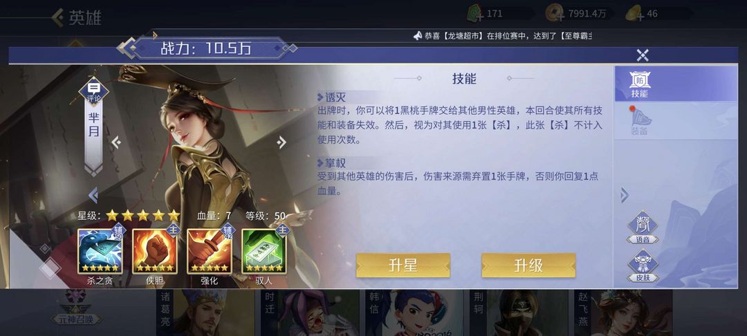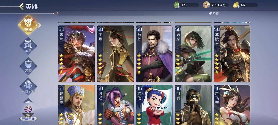 装备描述:英雄商鞅时迁诸葛亮芈月兰陵王四星虞姬 宝具四侠胆三傲剑三控局四驭人四杀贪三强化一精准两吸血三贪手。