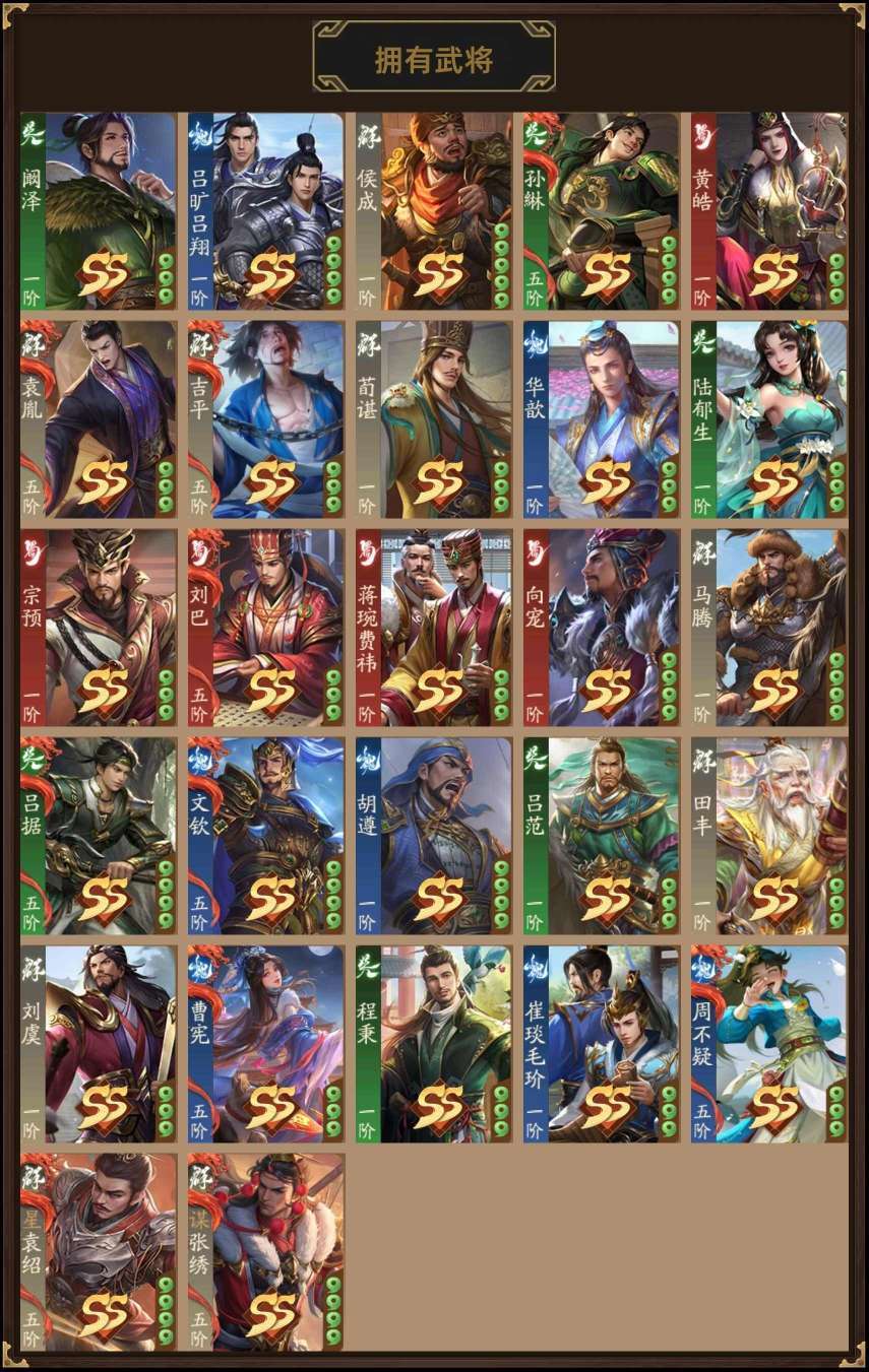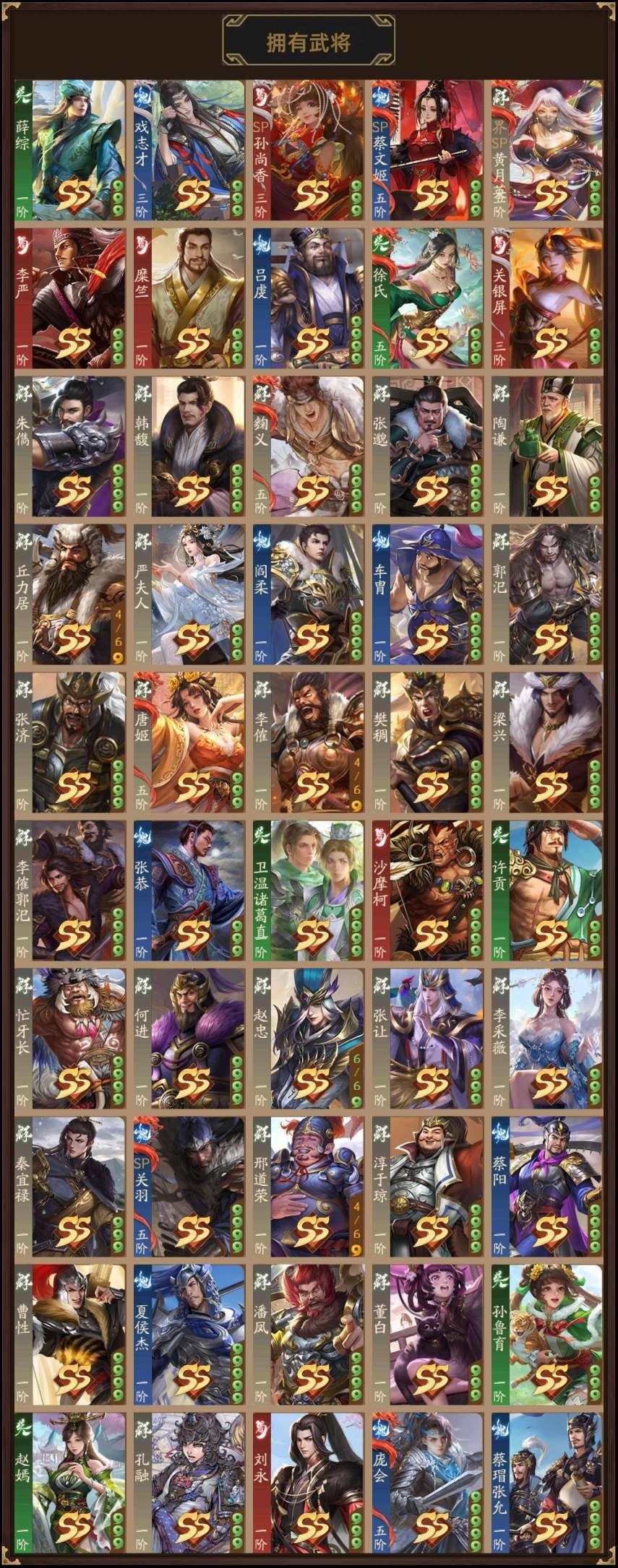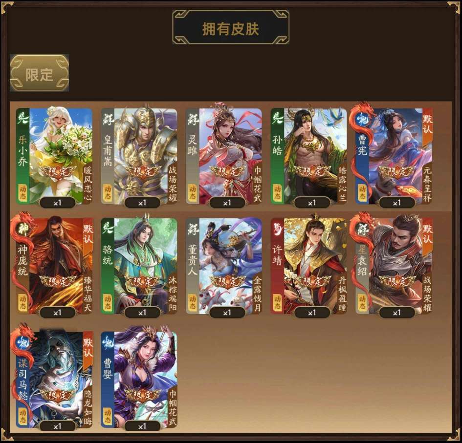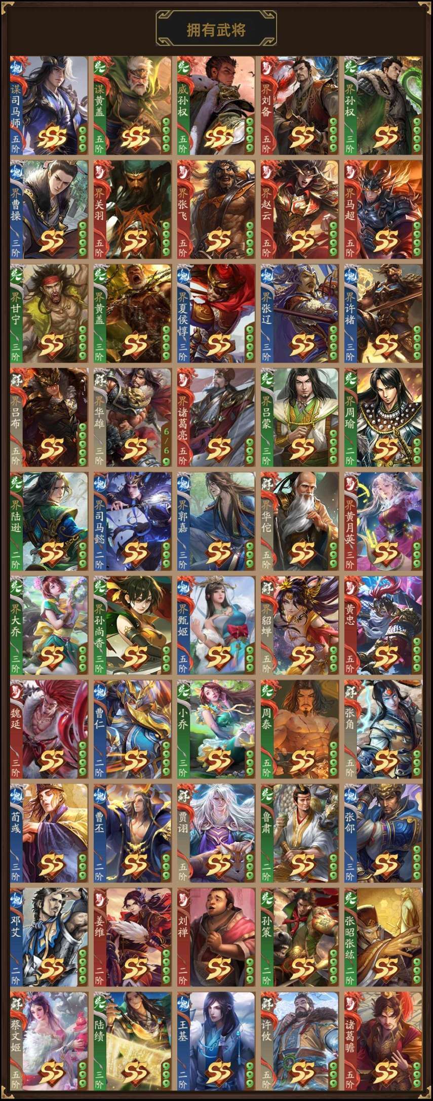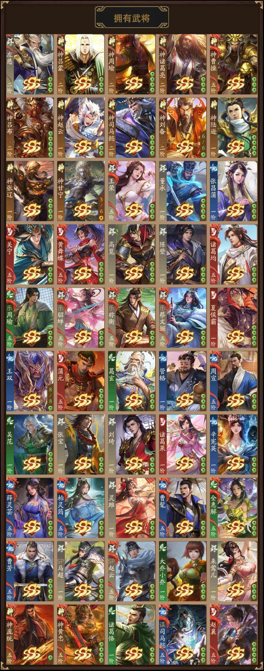 装备描述:威孙权/神庞统/神黄忠/谋司马懿/柏灵筠/薛灵筠/周宣/黄舞蝶/谋司马师/星袁绍/乐周瑜/乐蔡文姬/乐祢衡