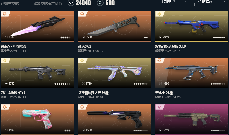 2.2w库存可排位✨盖亚塑水紫金狂徒✨侦查电玩781欢迎✨vct标配剥皮奇点蝴蝶刀