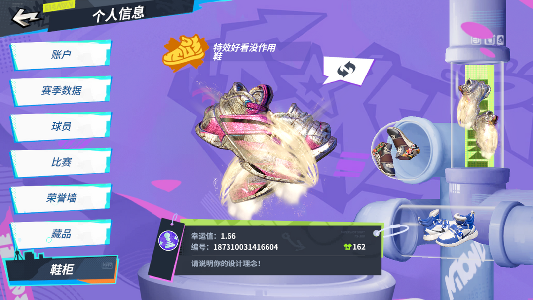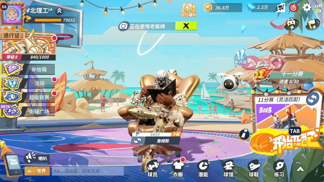 装备描述:时装宇航员全套、日耀全套、罗德曼专属球衣、灌篮熊等 球鞋蓝白AJ(分秒必争)反转沙暴(先手优势) 电动车、船、老板椅子
