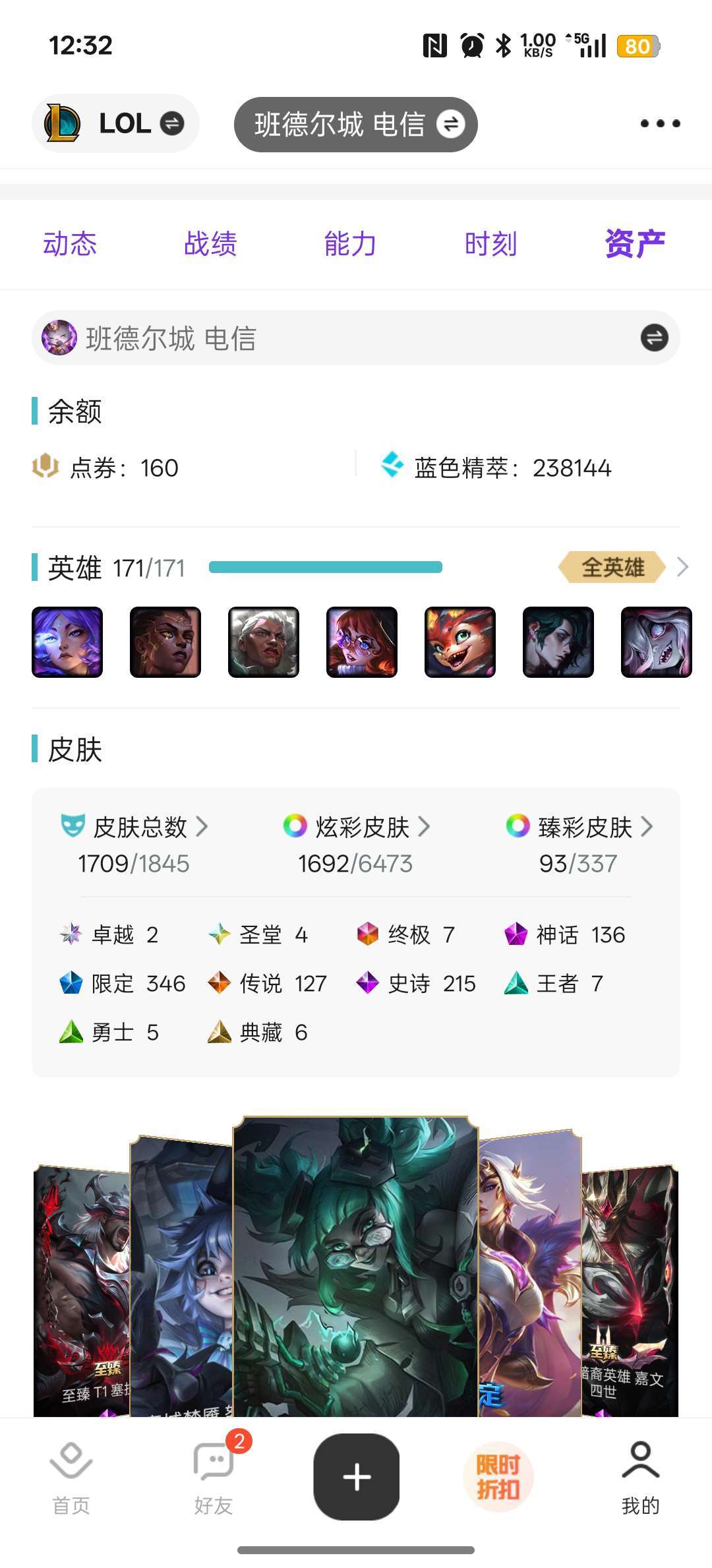 装备描述:账号原皮1700、至臻全套 、海克斯全套、 臻彩80多张、全英雄、水晶特效满、圣堂满、龙虾带两炫绿色、白色、莲花之令、神话幻想烬、厄运小姐、圣天龙、卧虎藏龙、养蜂人、 望各位老板爱惜别挂机别挂机,打完给个好评谢谢啦!排位千万别逃跑啊!好人一生平安!