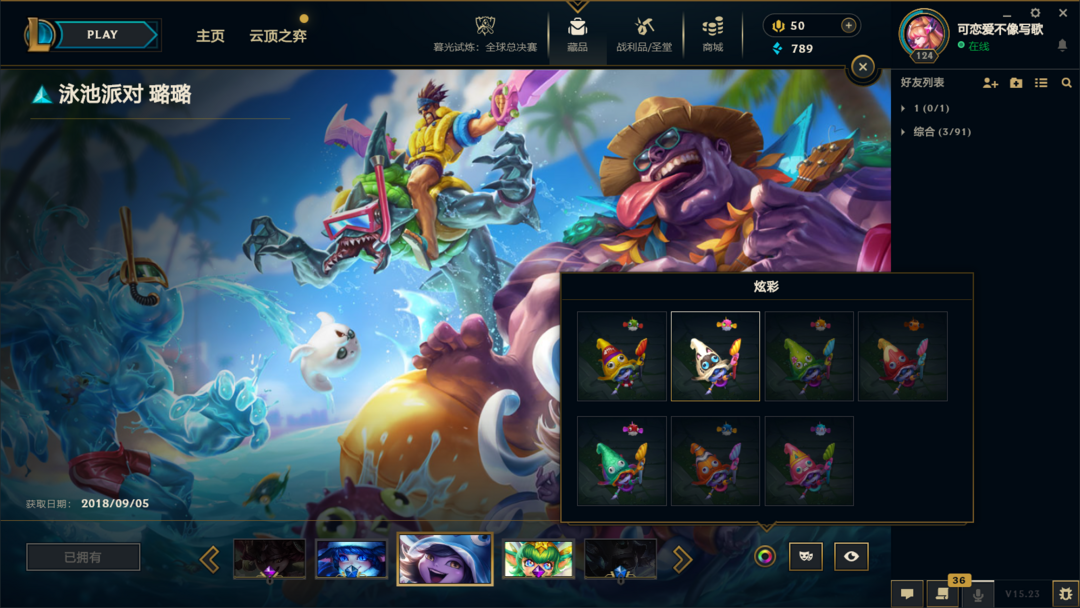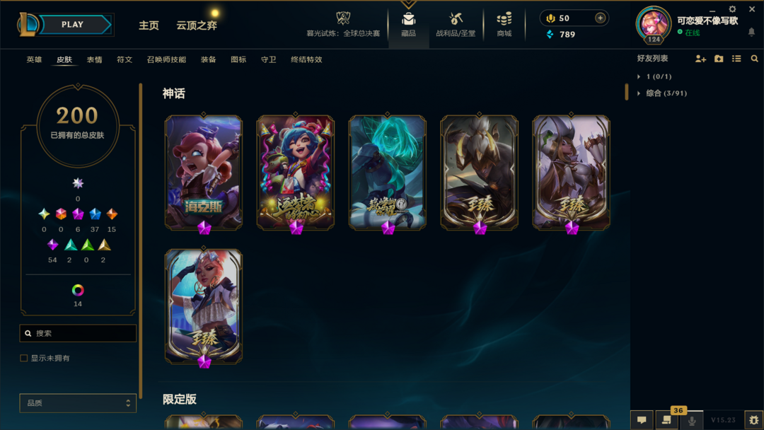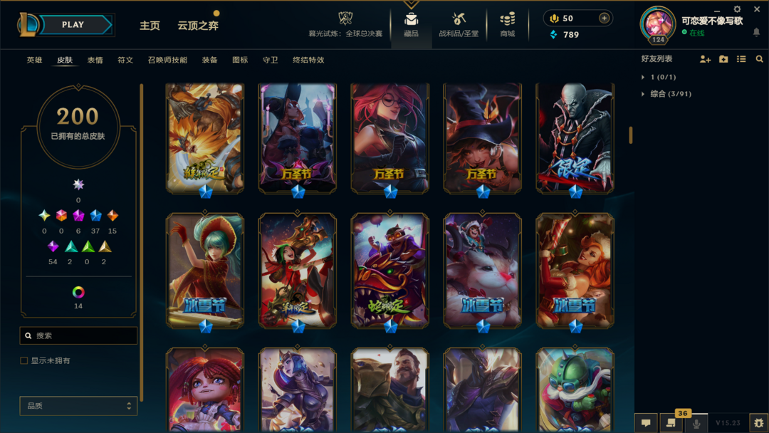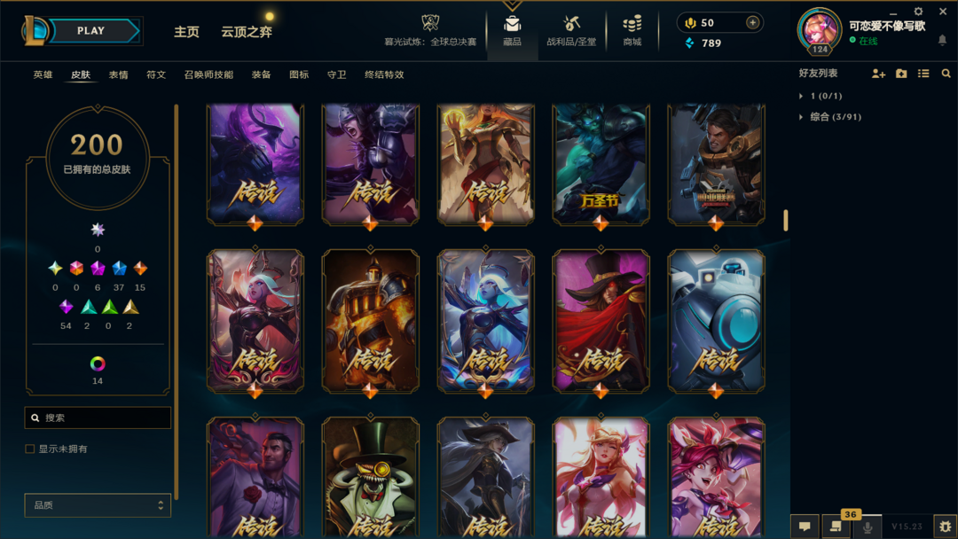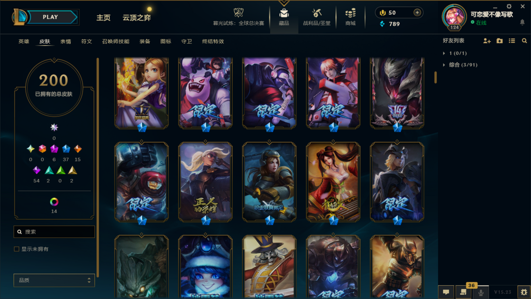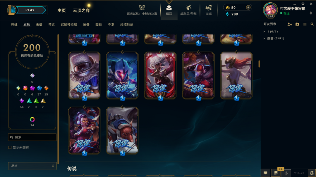 装备描述:皮肤:暮星之羽 霞;虚空使者 俄洛伊;暗星 锤石;深渊恐惧 锤石;战斗校长 悠米;源代码 娜美;SKT T1 娜美;海皇姬 娜美;鲛妮座人 娜美;锦鲤 娜美;胜利之剑 亚托克斯;至臻 真实伤害 奇亚娜;SKT T1 劫;星之守护者 金克丝;神龙烈焰 金克丝;黑帮狂花 金克丝;腥红之月 烬;源代码 卡蜜尔;弗雷尔卓德 塔莉垭;邪恶魔人 扎克;最后一只恐龙 纳尔;K/DA 卡莎;野火之藤 婕拉;方块王后 辛德拉;死亡之鹰 奎因;源代码 丽桑卓;天启骑士 杰斯;蔷薇绅士 杰斯;生化骑士 德莱厄斯;铁血帝皇 德莱厄斯;幽魂骑士 赫卡里姆;星之守护者 璐璐;泳池派对 璐璐;寒冬精灵 璐璐;邪恶女巫 璐璐;雪球也能爆炸! 吉格斯;死亡骑士 瑟庄妮;造物主 维克托;地底迷城 诺提勒斯;失落大陆 诺提勒斯;夜魔水晶 韦鲁斯;失落大陆 菲兹;胜利枪神 格雷福斯;杀出重围 格雷福斯;星之守护者 阿狸;冠军之血 希瓦娜;黯黑魔龙 希瓦娜;钢之逆鳞 希瓦娜;沙之守护 泽拉斯;枯萎之壤 泽拉斯;战地法师 泽拉斯;符文生物 泽拉斯;钢铁军团 拉克丝;星际迷航 拉克丝;暗杀星 慎;主治医师 慎;炎爆 慎;极寒 慎;