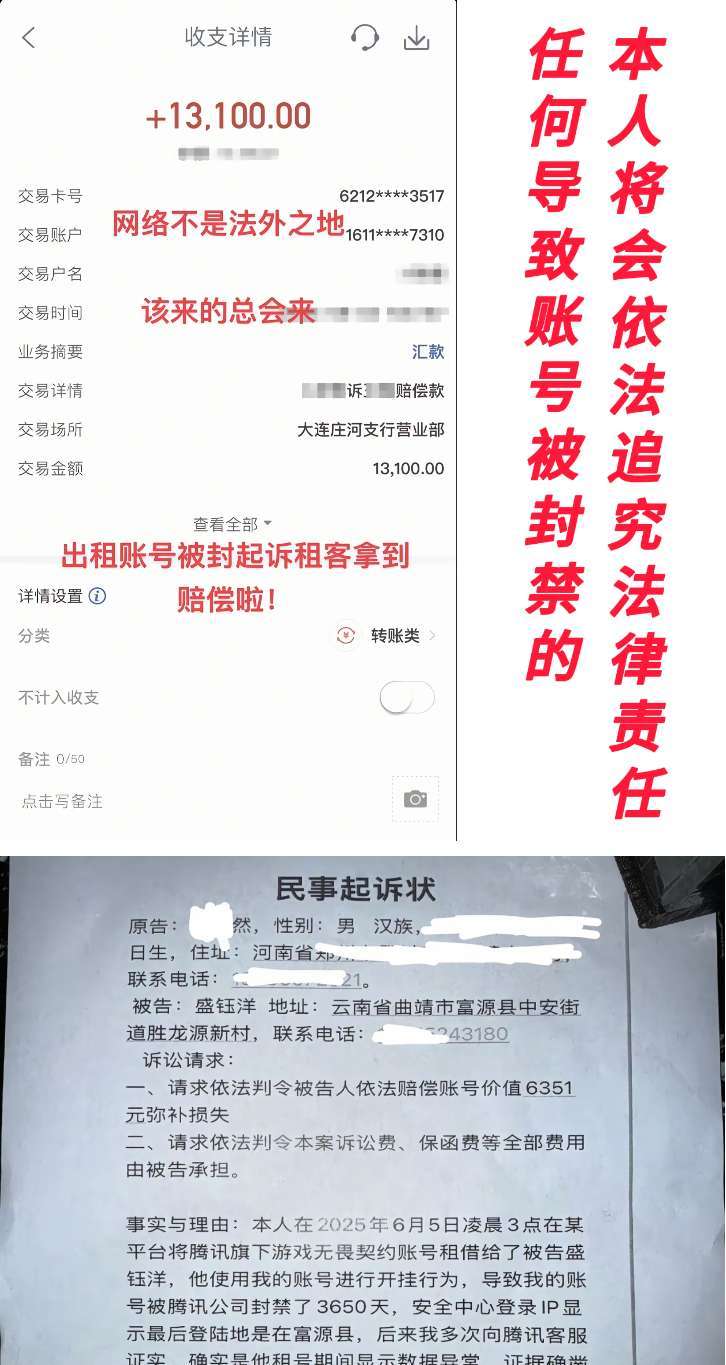 限制: 撤单率<20%才可租用此帐号装备描述:⚠️租客有异常游戏行为,号主将会顶号应急处理。 ⚠️禁止使用鼠标、键盘、手柄。 ⚠️因为排位炸鱼,被封号的,扣除押金。 ⚠️因为违反游戏规定被封的,将依法追究责任。 ⚠️封十年的,照价赔偿。(已经有相关法律) ⚠️不要抱侥幸心理,不要觉得无所谓,现在科技那么发达,追究你的责任是很简单的。