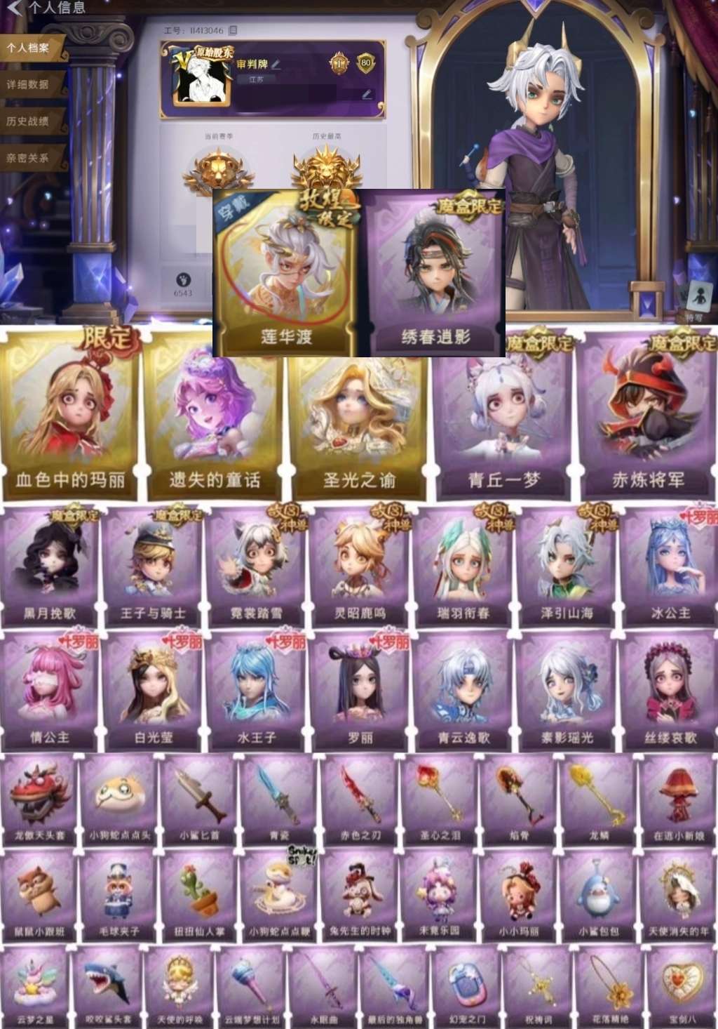 限制: 撤单率<29%才可租用此帐号装备描述:账密登陆一单一密放心玩 恶意撤单会秒挤号拉黑 有内测龙头套和原始股东头像框 4金:血色中的玛丽+遗失的童话+圣光之谕+莲华渡满抽 18紫:s1青丘一梦/s2赤练将军/s3黑月挽歌/s4王子与骑士/s5绣春,4故宫联动全套,2青花瓷全套,5叶罗丽联动全套,丝缕哀歌,呱呱雨衣 其他:小鲨匕首抽满,小狗蛇点点鞭抽满,有兔宝特权 安卓苹果互通登陆,铲铲币且用且珍惜,如果没了麻烦自己摸一把 喜欢本账号请点点❤️收藏❤️,方便下次租用哦~
