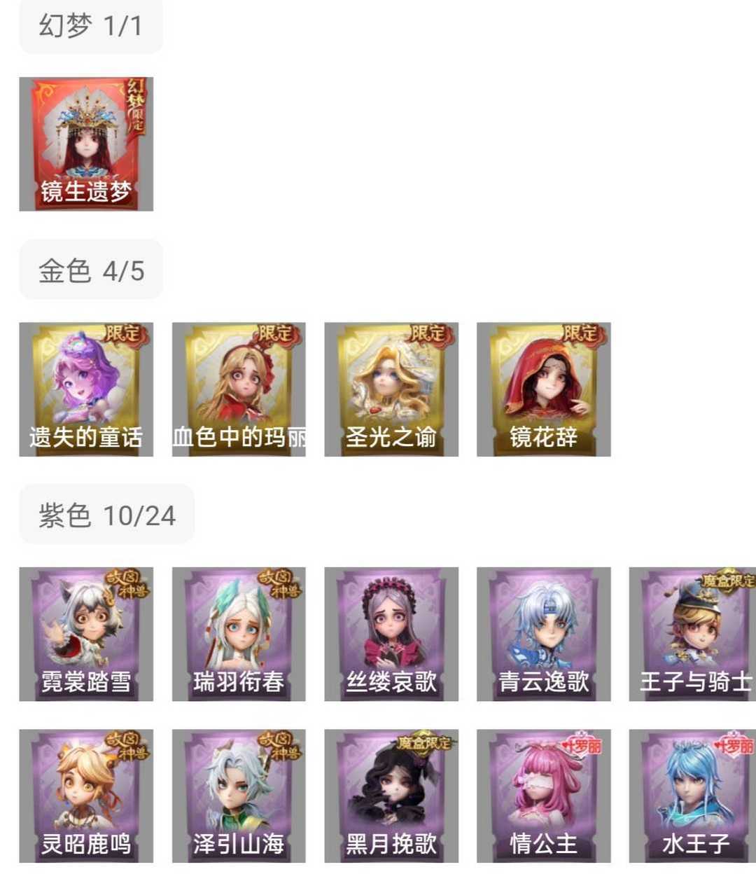 1红4金10紫24道具❤️镜生遗梦❤️圣光之谕❤️遗失的童话❤️玛丽❤️黑月挽歌❤️情公主❤️