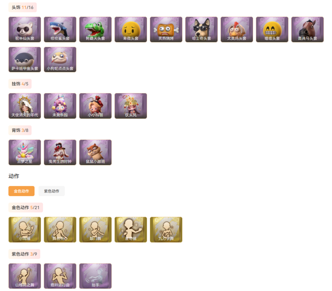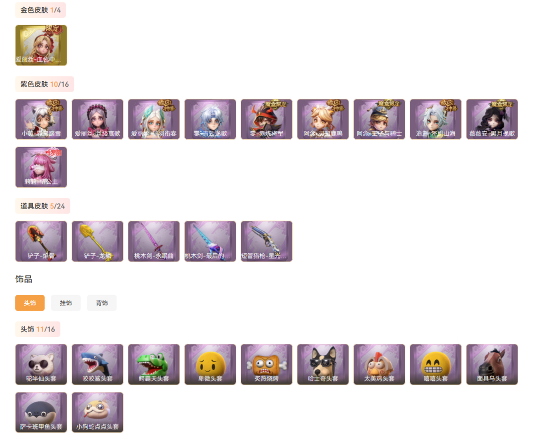 限制: 租号20次及以上 |装备描述:皮肤:爱丽丝-血色中的玛丽,小黄-霓裳踏雪,逍遥-泽引山海,爱丽丝-丝缕哀歌,爱丽丝-瑞羽衔春、冰公主,薇薇安-黑月挽歌,零-青云逸歌,零-赤炼将军,阿念-王子与骑士,阿念-灵昭鹿鸣,莉莉-情公主;饰品:头饰-炙热烧烤,头饰-小狗蛇点点头套,头饰-鳄霸天头套,头饰-驼半仙头套,头饰-咬咬鲨头套,头饰-太美鸡头套,头饰-面具马头套,头饰-哈士奇头套,头饰-嘻嘻头套,头饰-萨卡班甲鱼头套,头饰-卑微头套,背饰-云梦之星,背饰-兔先生的时钟,背饰-鼠鼠小跟班,挂饰-钗头凤,挂饰-天使消失的年代,挂饰-未竟乐园,挂饰-小小玛丽;道具:铲子-龙鳞,铲子-焰骨,桃木剑-永眠曲,桃木剑-最后的独角兽,短管猎枪-星光的裁决;动作:动作-小雨摇,动作-星奇摇,动作-九万字舞,动作-舞台中心,动作-敲门舞,动作-山楂树之舞,动作-痞帅进行曲,动作-抬手;工牌:工牌-卷珠帘,工牌-蓝海奇遇,工牌-情语塔,工牌-圣光之誓,工牌-童话扉页,工牌-舞台终演