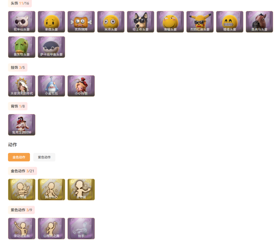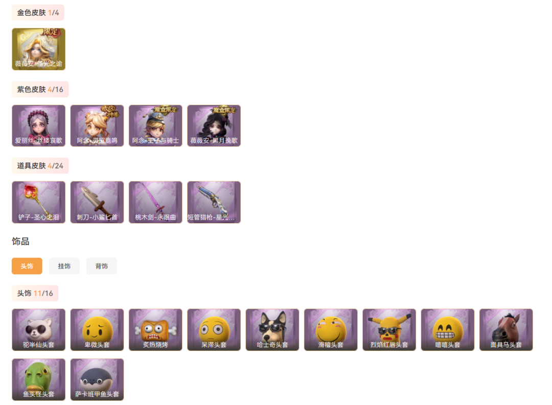 限制: 租号20次及以上 |装备描述:皮肤:薇薇安-圣光之谕,爱丽丝-丝缕哀歌,薇薇安-黑月挽歌,阿念-王子与骑士,阿念-灵昭鹿鸣;饰品:头饰-炙热烧烤,头饰-驼半仙头套,头饰-鱼头怪头套,头饰-面具马头套,头饰-哈士奇头套,头饰-烈焰红唇头套,头饰-嘻嘻头套,头饰-滑稽头套,头饰-呆滞头套,头饰-卑微头套,头饰-萨卡班甲鱼头套,背饰-兔先生的时钟,挂饰-小鲨包包,挂饰-天使消失的年代,挂饰-小小玛丽;道具:铲子-圣心之泪,桃木剑-永眠曲,刺刀-小鲨匕首,短管猎枪-星光的裁决;动作:动作-舞台中心,动作-星奇摇,动作-小雨摇,动作-山楂树之舞,动作-律动迪斯科,动作-抬手;工牌:工牌-卷珠帘,工牌-点点萌伴,工牌-蓝海奇遇,工牌-童话扉页