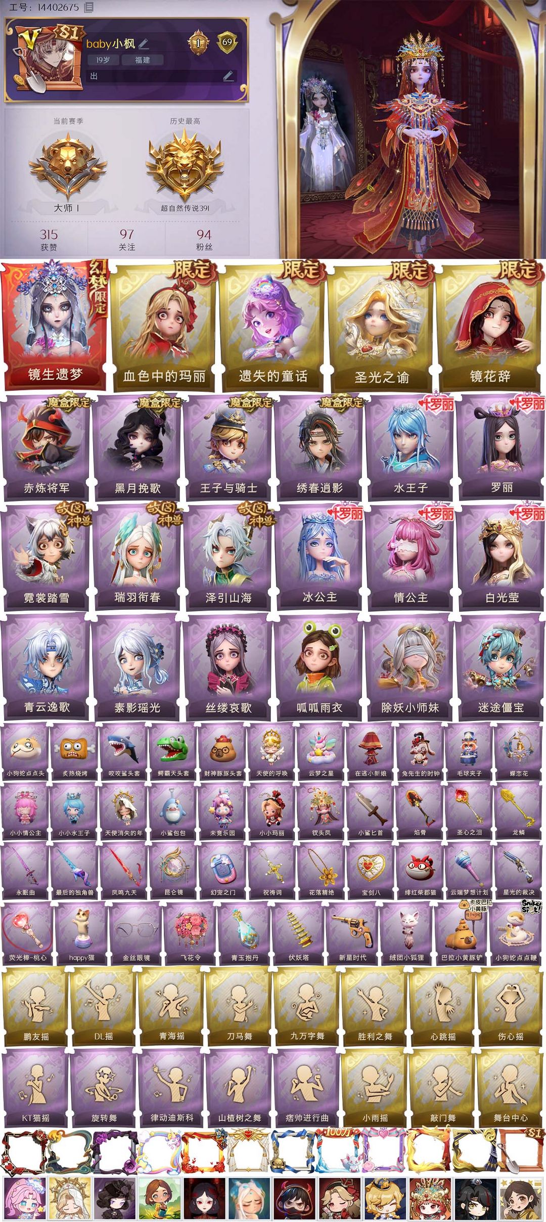 装备描述:一单一改密,老板喜欢请下单!!! 伪图鉴伪全皮✨满抽莲花渡✨镜生遗梦✨全魔盒1幻梦5金20紫✨绘梦厅满抽✨兔宝赤炼青丘白泽卡皮晶澜灵翼