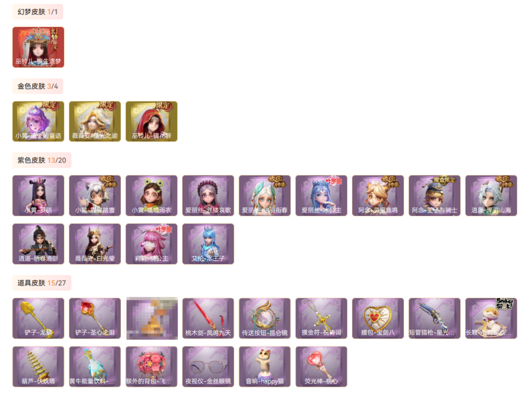限制: 租号20次及以上 |装备描述:【幻梦皮肤】镜生遗梦 【金色皮肤】圣光之谕、遗失的童话、镜花辞 【紫色皮肤】除妖小师妹、迷途僵宝、王子与骑士、情公主、水王子、冰公主、罗丽、白光莹、泽引山海、灵昭鹿鸣、瑞羽衔春、霓裳踏雪、青云逸歌、素影瑶光、丝缕哀歌、绣春逍影、呱呱雨衣、 【道具皮肤】碧络琅环、龙鳞、圣心之泪、祝祷词、宝剑八、星光的裁决、小狗蛇点点鞭、昆仑镜、伏妖塔、青玉抱丹、飞花令、金丝眼镜、happy猫、桃心、凤鸣九天、乘风溯雪、新星时代、 【金色动作】刀马舞、心跳摇、小雨摇、舞台中心、伤心摇、DL摇、鹏友摇