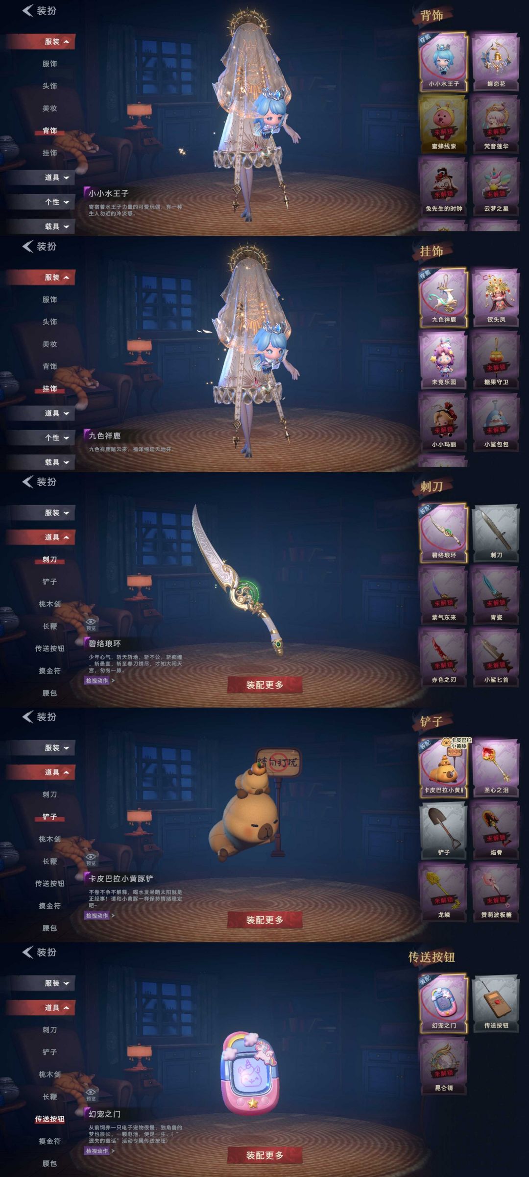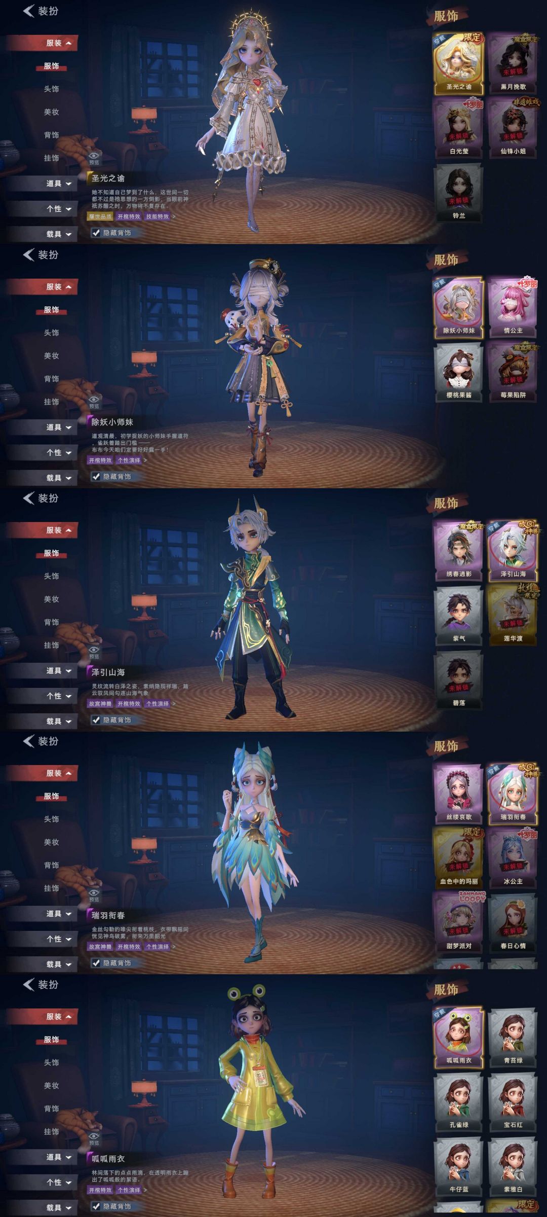 1金♉7紫♉圣光之谕♋除妖小师妹♋情公主⛎绣春逍影⛎泽引山海♑瑞羽衔春♑丝缕哀歌♉呱呱雨衣♉小黄豚铲