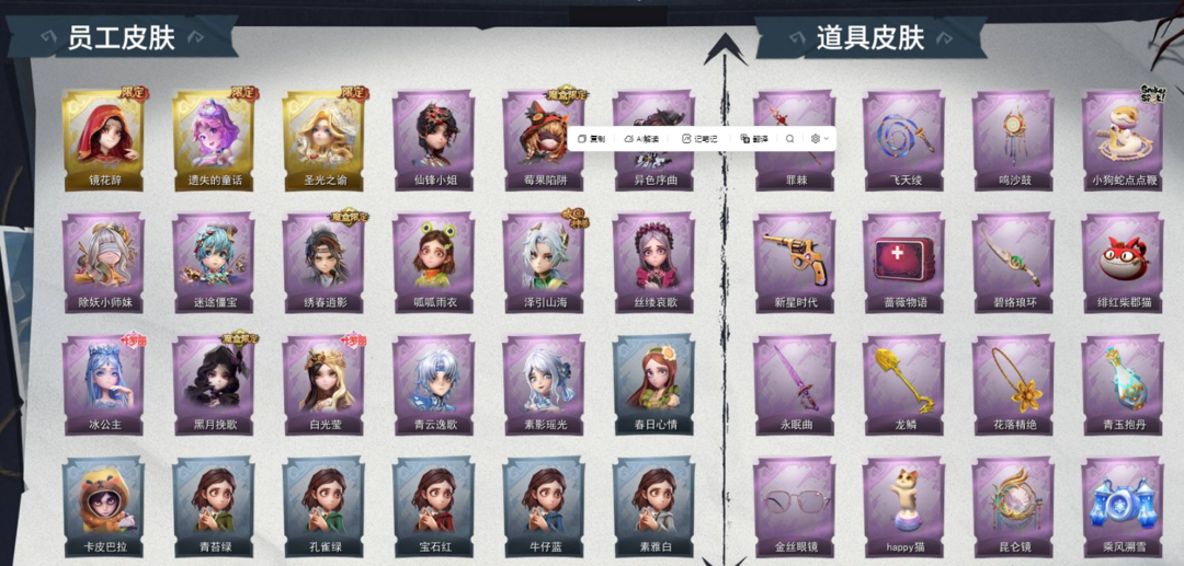 装备描述:【段位】超自然传说 【金色皮肤数量】3 【紫色皮肤数量】14 【道具皮肤数量】19 【铲铲币】2822 【累充】15580金砖 【赛季魔盒】稀世豪华魔盒 【员工】小黄、爱丽丝、零、阿念、逍遥、薇薇安、巫铃儿、莉莉、艾伦、爱德华、兰 【金色皮肤】薇薇安-圣光之谕、小黄-遗失的童话、巫铃儿-镜花辞 【紫色皮肤】薇薇安-仙锋小姐、莉莉-莓果陷阱、小黄-异色序曲、阿念-迷途僵宝、莉莉-除妖小师妹、薇薇安-黑月挽歌、爱丽丝-冰公主、薇薇安-白光莹、逍遥-泽引山海、零-青云逸歌、巫铃儿-素影瑶光、爱丽丝-丝缕哀歌、逍遥-绣春逍影、小黄-呱呱雨衣 【道具皮肤】铲子-龙鳞、转轮手枪-新星时代、音响-happy猫、夜视仪-金丝眼镜、传送按钮-昆仑镜、桃木剑-永眠曲、长鞭-小狗蛇点点鞭、刺刀-碧络琅环、长鞭-飞天绫、音响-鸣沙鼓、喷气背包-乘风溯雪、腰包-绯红柴郡猫、摸金符-花落精绝、急救包-蔷薇物语、黄牛能量饮料-青玉抱丹、背饰-潮汐小海兔、背饰-云梦之星、背饰-蝶恋花、背饰-在逃小新娘 【头饰】樱桃奶油布丁、惊魂南瓜头套、鱼头怪头套、烈焰红唇头套、大葱明头套、火爆了头套、面具马头套、哈士奇头套、萨卡班