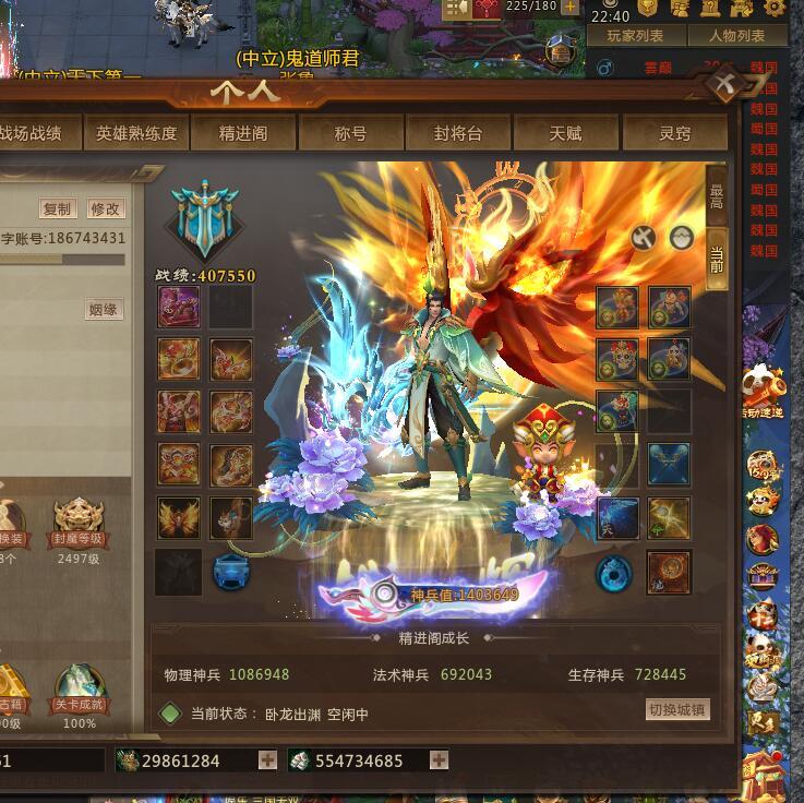 装备描述:活动图三宝 于禁皮肤 已经有了 +刷副本+打出征都可以,体验极好+玩具有鬼帝九尾等等,周年活动已经做士兵2200W