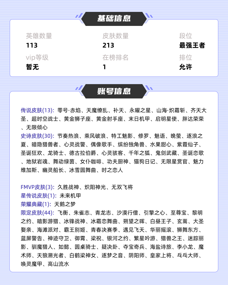 装备描述:>>>>>>毁号,涉及毁坏虚拟财产罪及计算机安全罪,请文明游戏素质游戏,让我们共建美好租号平台>>>>>> 本游戏账号: ,英雄多,皮肤多。典藏皮肤1个,感受典藏皮肤带来的优质体验快感,FMVP皮肤3个,尽情享受FMVP皮肤带来的主角光环, 私人所属英雄皮肤有:小乔 天鹅之梦杨戬 永曜之星||梦奇 胖达荣荣||达摩 黄金狮子座||李信 山海·炽霜斩||孙尚香 末日机甲||孙悟空 零号·赤焰||孙悟空 齐天大圣||狄仁杰 超时空战士||后羿 黄金射手座||虞姬 启明星使||项羽 无限倾心||女娲 补天||吕布 天魔缭乱,/镜 炽阳神光等等 注意事项: A.游戏过程中请不要恶意挂机或者不文明发言;B.恶意挂机、顶号等行为将被拉黑无法再次下单;C.进入游戏后中途请勿退出登陆,否则无法再次上号;D.部分账号由于异地登录可能会出现密码错误提示,通常再尝试5-6次后可上号。 |||||||||>喜欢本账号请点 ☆收藏☆ 方便下次租用,谢谢光临惠顾|||||||||
