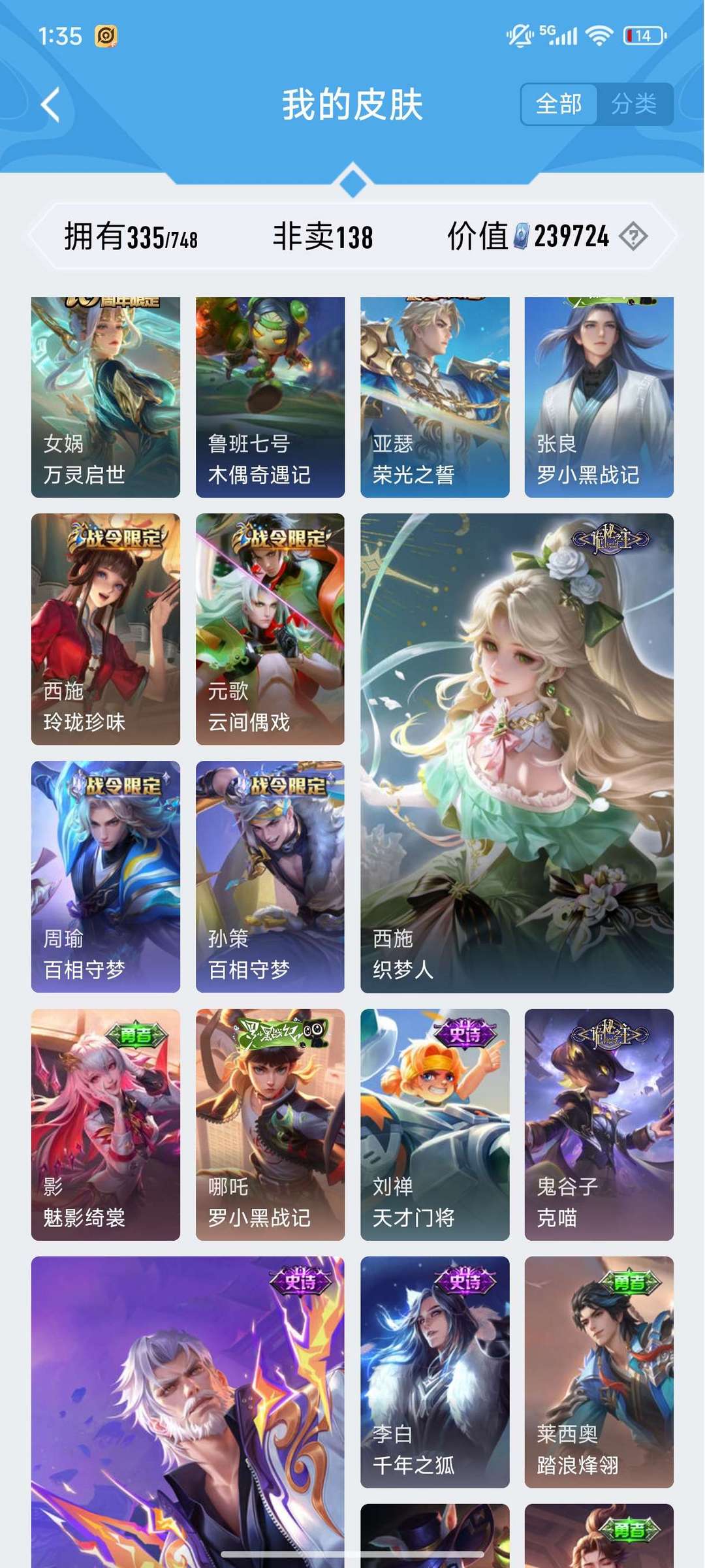 装备描述:全英雄300+皮肤,铭文满铭文,历史荣耀王者,当前段位至圣王者。多传说皮肤,多款史诗皮肤。至尊宝、紫霞仙子