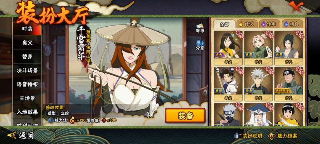 装备描述:漂泊全系列,侠隐全系列, 爱情哥,黑绝,泳装小南,忍战艾,新春止水,漂泊再不斩已秒 高攻击 51魅力 339忍者新忍者基本都有 如遇顶号是上位租客顶的,顶回去就好了