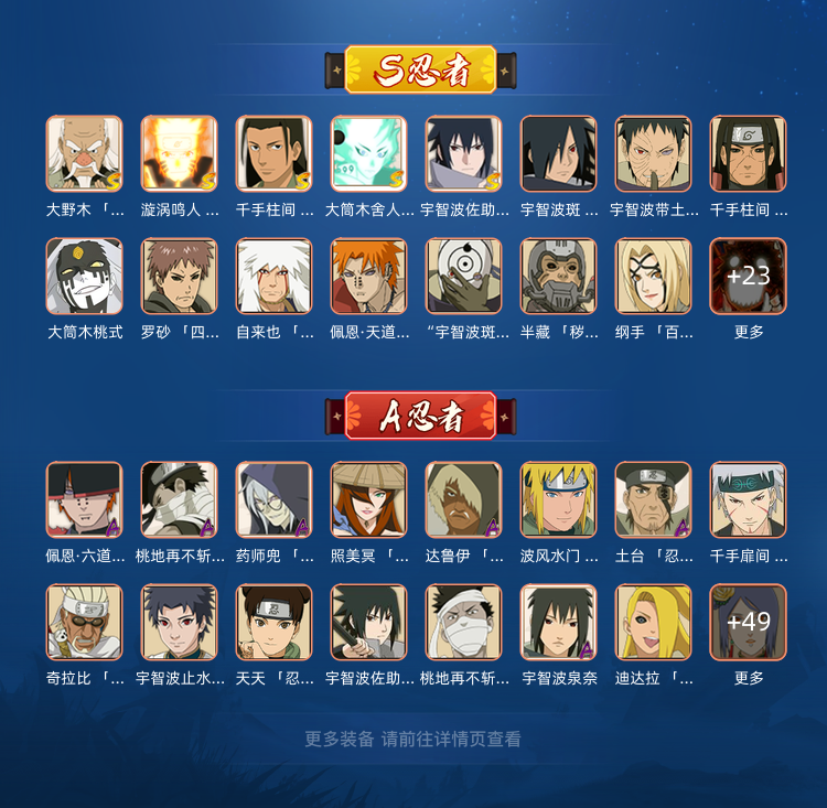 装备描述:侠影佐助,九尾水门,鸡翅,惊门凯,四个蝎,漂泊全套A,多侠影系列