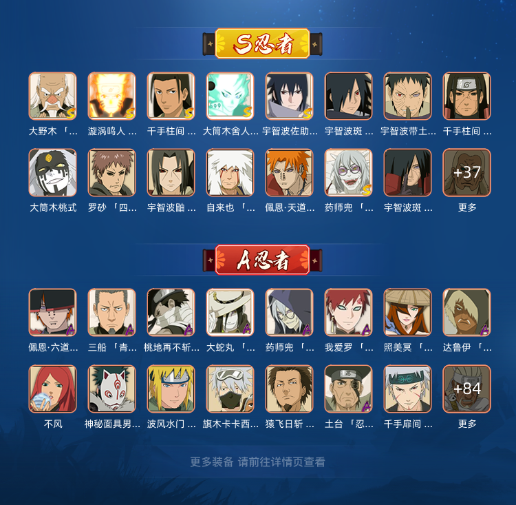 装备描述:53s102A⭐侠隐佐助带皮肤⭐六尾鸣人⭐全忍法帖⭐全S⭐全A⭐全通灵秘卷⭐三千七百万战力⭐全皮肤