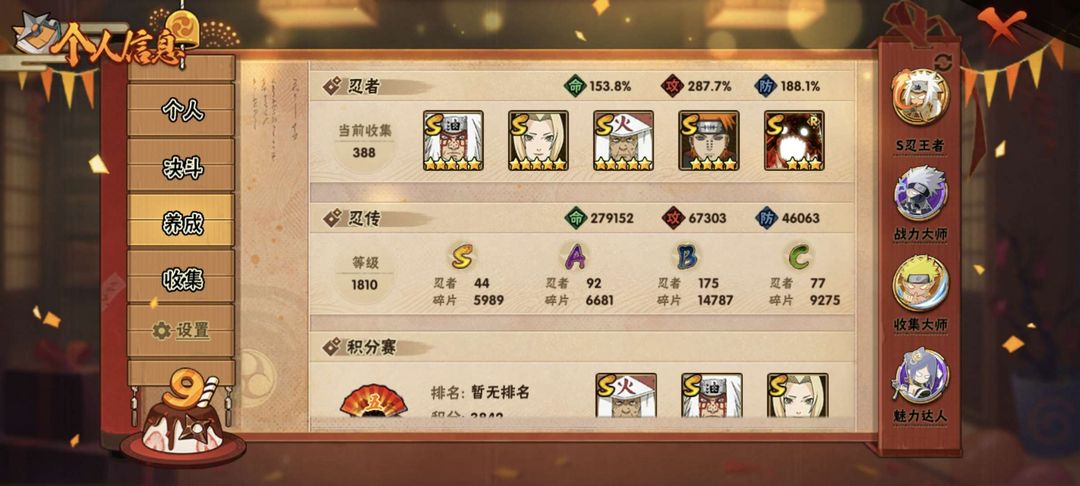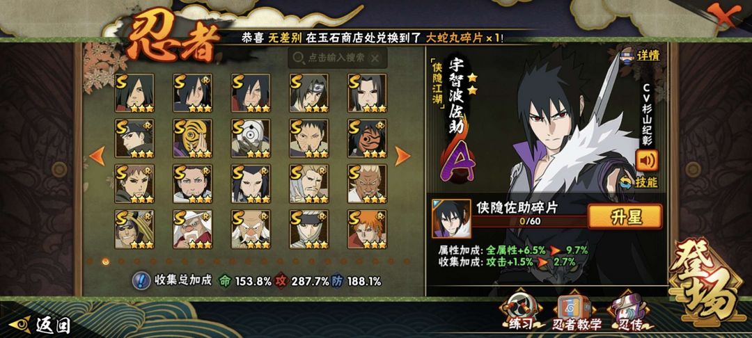 装备描述:44S92A,388个忍者,战力2330万可带团本,满级霸体多氪金通灵