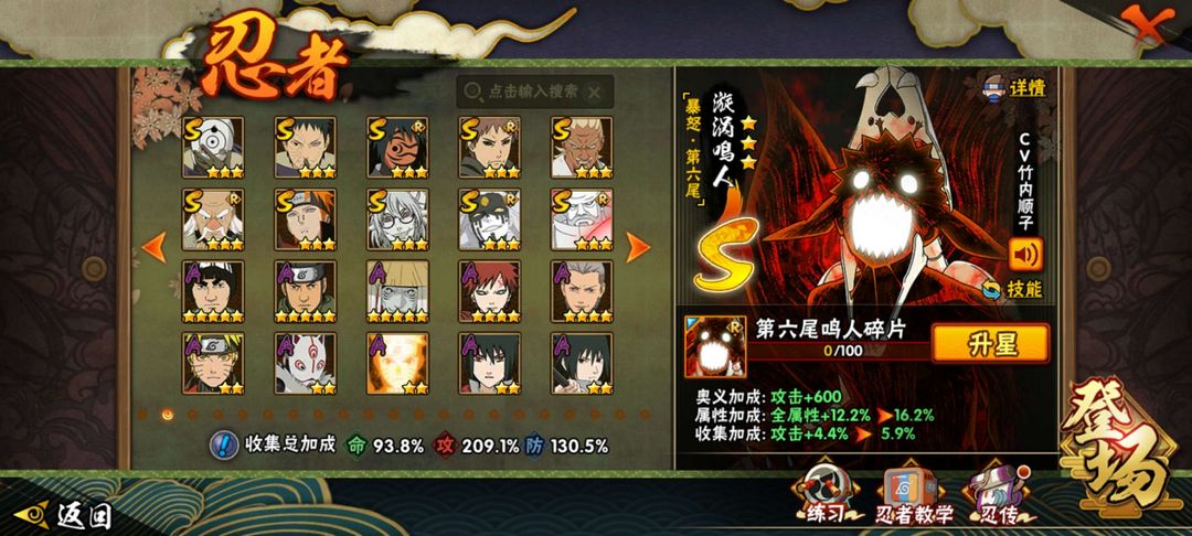 装备描述:30s 49a 269忍 侠隐佐助加皮肤,侠隐药师兜加皮肤,11付费忍者,1200w战力