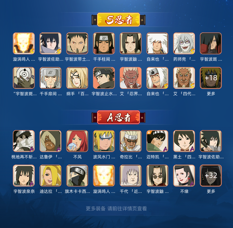 装备描述:34S♈2100W战力♈九喇嘛水门♈须佐卡卡西♈须佐止水♈忍战带土♈白面具♈九喇嘛鸣人♈永恒佐助♈秽土解斑♈秽土柱间♈秽土二代♈秽土三代♈秽土水门♈忍战樱♈天道超♈宇智波鼬♈雷影♈宇智波斑♈长门♈死门凯♈百豪纲手♈秽土鼬♈天道佩恩