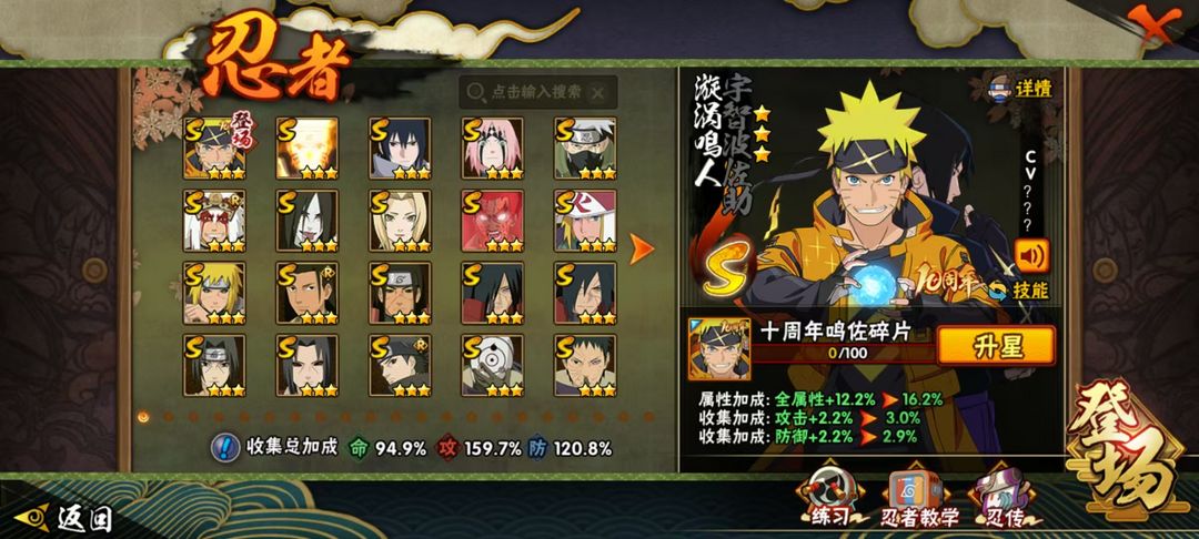 装备描述:1. 火影中高阶号甩!十周年鸣佐+满屏S忍,收集加成攻159.7%太顶了 2. 火影账号出,带十周年鸣佐,海量S忍齐,属性加成命94.9%/攻159.7%/防120.8% 3. 火影成品号!十周年鸣佐在手,超多S忍,收集加成直接拉满,速来