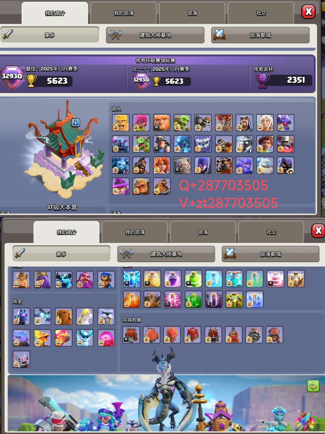 装备描述:(下单加账号,号主辅助扫二维 玛 上号,介意勿扰。晚上24点以后号主要睡觉了,想租的话可以提前说。用大号加好友,小号加不会同意,以免有出生司马毁号仔) 第二张图有Q和V搜索 先加好友租2r一小时,日租斯聊 国服17本泰坦杯,控制一下杯别上传奇(5000杯),可以退部落 取消建筑升级,开脚本,搞诈骗和毁号的会拉黑举报