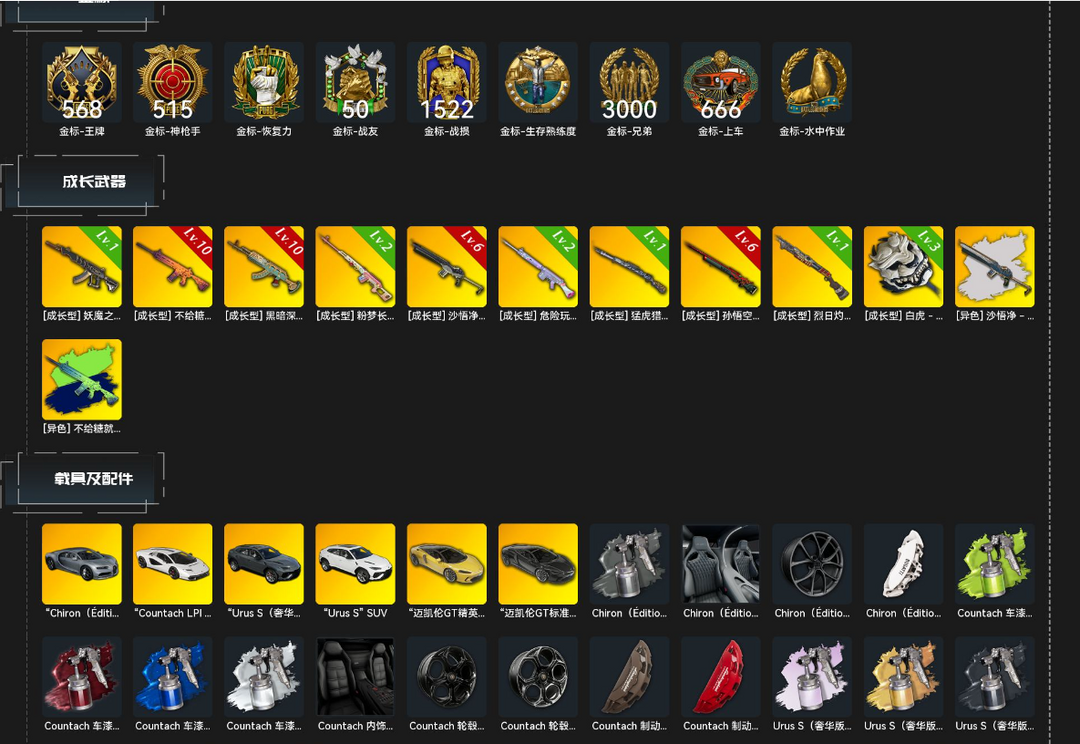 限制: 租号1次及以上 | 撤单率<70%才可租用此帐号装备描述:穿搭车皮底子号,3满号,10成长武器,双异色,白色渔夫帽,白色永久soopT恤,布加迪,兰博,迈凯伦, 【大厅】交易所接待室,武器神龛 【成长武器】[成长型] 不给糖就捣蛋 - M416[10级],[成长型] 粉梦长眠 - 德拉贡诺夫[2级],[成长型] 孙悟空 - M24[6级],[成长型] 猛虎猎手 - Kar98k[1级],[成长型] 黑暗深渊 - Beryl M762[10级],[成长型] 沙悟净 - Mini14[6级],[成长型] 妖魔之触 - ACE32[1级],[成长型] 烈日灼烧 - S1897[1级],[成长型] 白虎 - 平底锅[3级],[成长型] 危险玩偶屋 - SLR[2级] 【异色皮肤】[异色] 不给糖就捣蛋 - M416(绿色配海军蓝),[异色] 沙悟净 - Mini14(银色) 【外观】发型29,卡翠娜妆容,萨迪娅·库雷希,小丑发型,发型44,美人鱼发型,维纳斯面部妆容,发型27,发型36,小丑妆,发型64,萨迪娅的头纱,匕首纹饰加红晕妆容,发型31,PUBG x NewJeans MINJI,美人鱼妆容,朱莉·斯科尔斯,发型16,发型43,乔纳森·卡茂